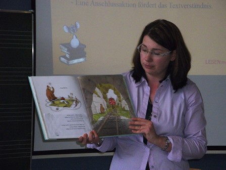 Nach der Begrüßung und Vorstellungsrunde erklärte Frau Sonja Liebsch von der Stiftung Lesen warum Lesen und Vorlesen so wichtig sind. Sie zeigte, wie eine gute Vorleseatmosphäre geschaffen wird und umriss kurz die sechs Phasen des Spracherwerbs, die entscheidend sind bei der Fragestellung, welche Bücher sich für welches Alter und welches Geschlecht eignen.
