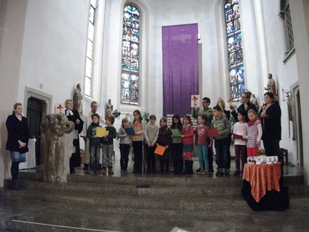 Schülerinnen und Schüler der Klasse 2b erklären die Farbsymbolik der Kreuze. Religionslehrerinnen und –lehrer nehmen die neuen Kreuze symbolisch entgegen.