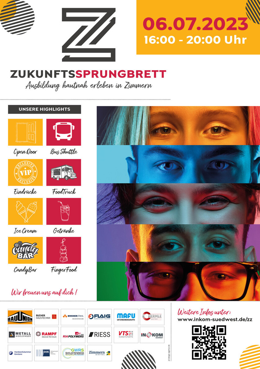 Am Donnerstag, den 6.7., 16.00 Uhr - 20.00 Uhr findet im INKOM Zimmern das Zukunftsprungbrett unter Einbindung unserer Kooperationsschule GWRS Zimmern statt. An diesem Tag präsentieren sich ausgewählte Firmen (siehe Anhang) und stellen ihre Ausbildungsmöglichkeiten/Studienmöglichkeiten vor.