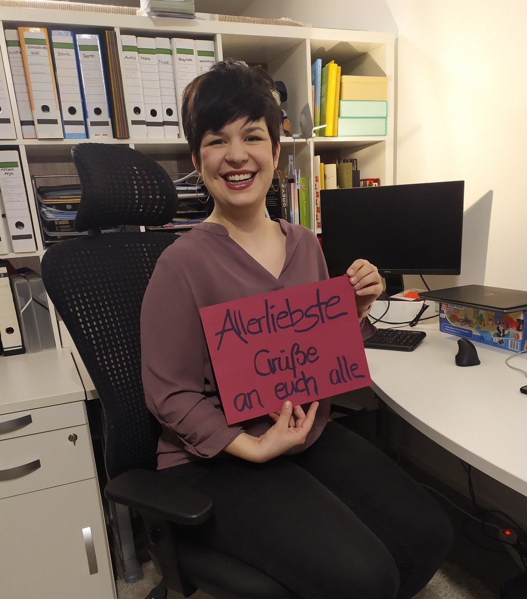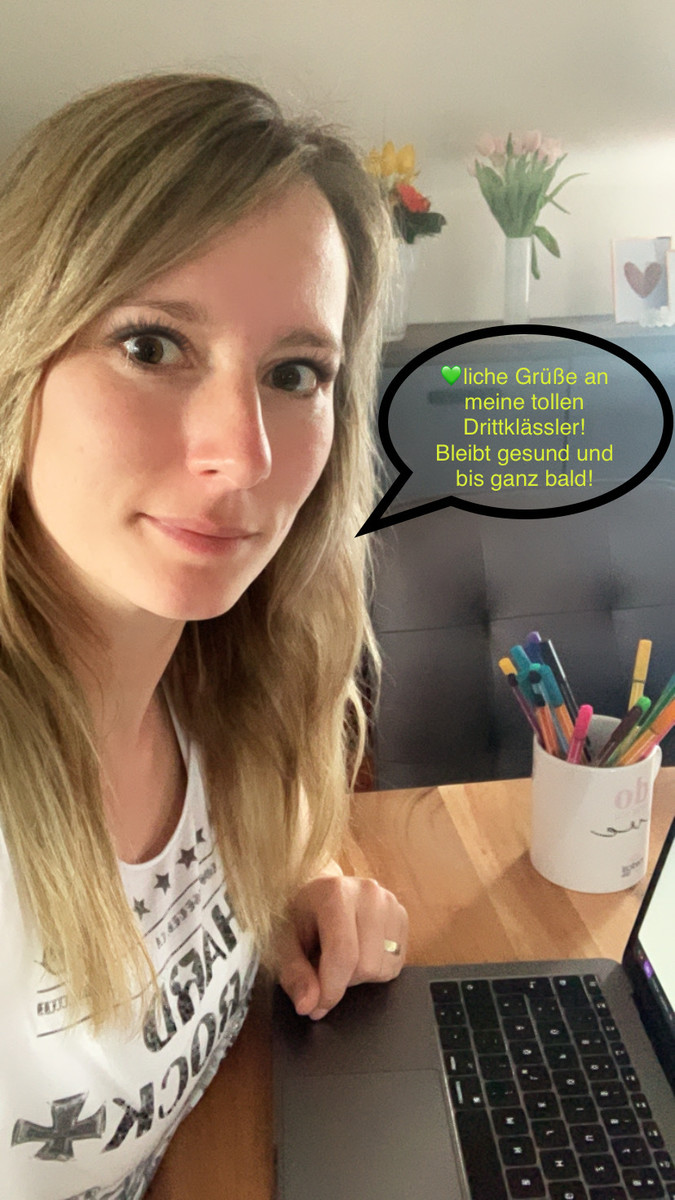 "Herzliche Grüße aus dem Homeoffice von mir. Ich hoffe, es geht euch allen gut und ihr kommt mit euren Lernplanaufgaben zurecht?! Bei Fragen dürft ihr euch natürlich weiterhin sehr gerne bei mir melden. Ich freue mich schon darauf, euch alle bald wieder zu sehen". Eure Monja Suhm