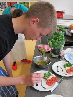Italien lieferte einen Augenschmaus: Der Vorspeisensalat „Caprese“ eröffnete das Menü in den Farben Italiens (Tomaten, Mozzarella und Basilikumblätter mit Pesto). Auch die Tischdekoration wurde von den Wettbewerbsteilnehmern erweitert und stimmte die Jury positiv.