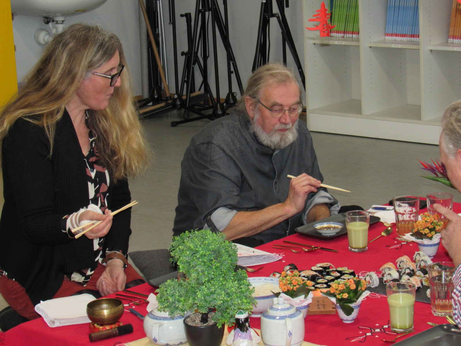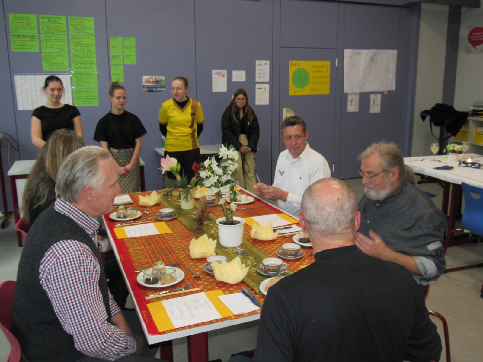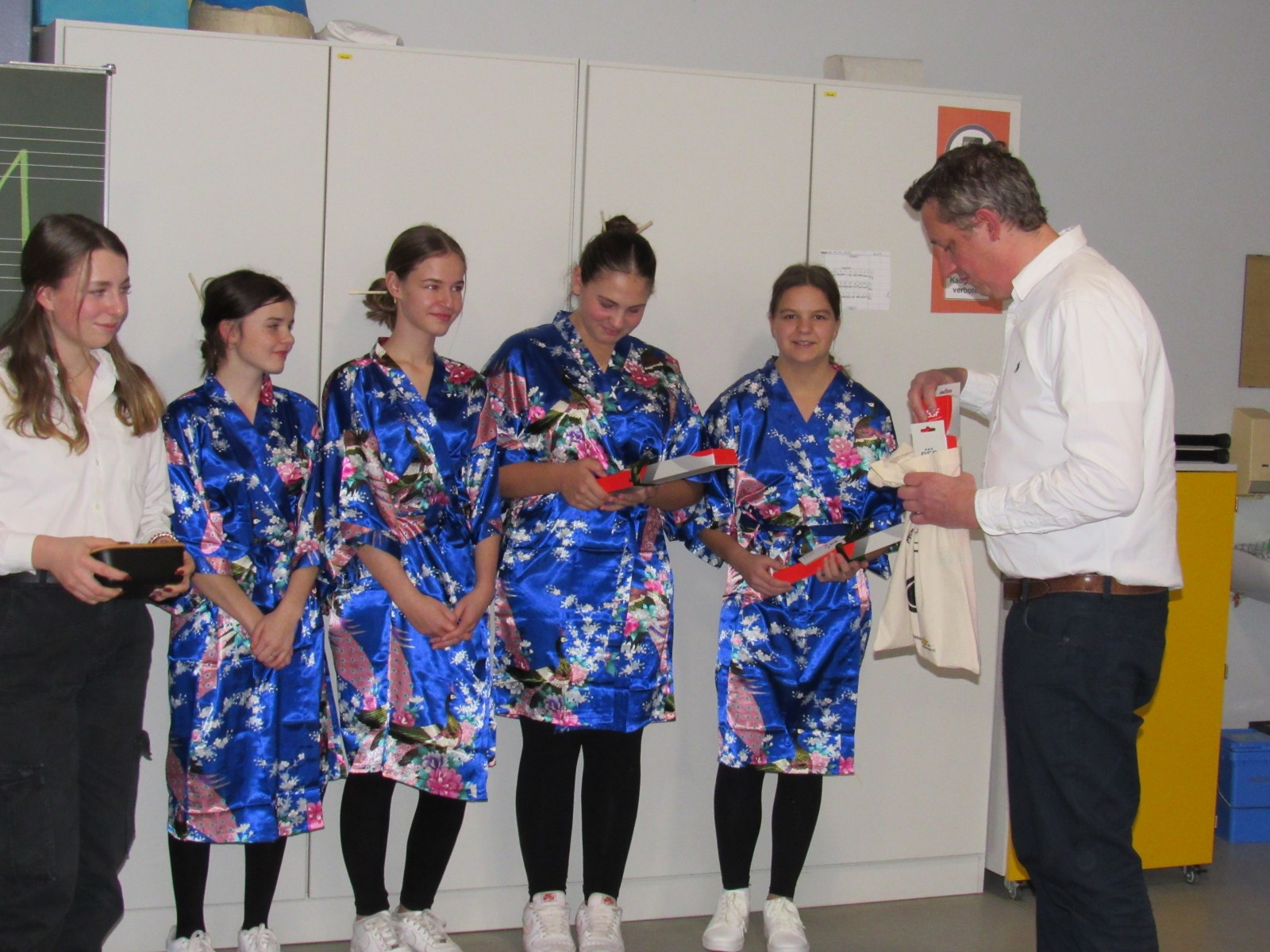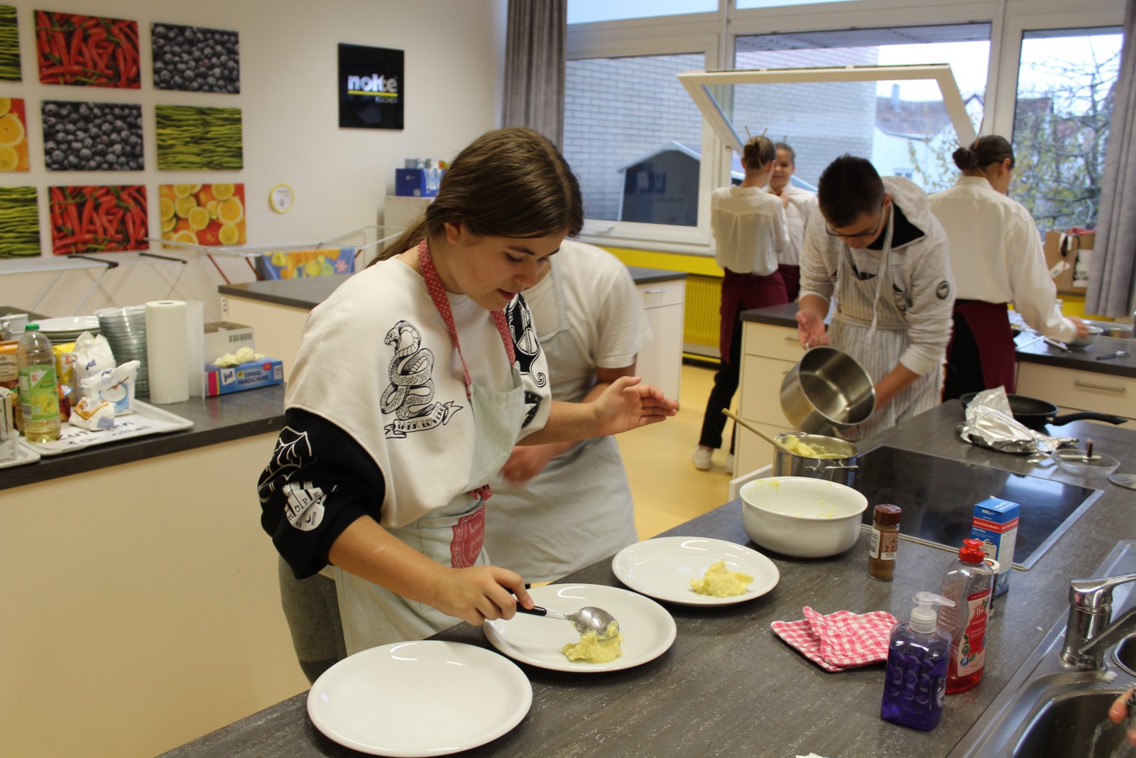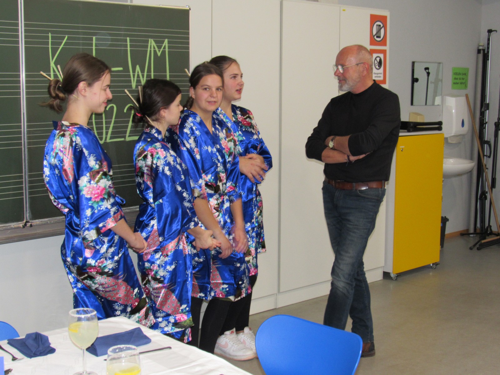 Lang war von Beginn an in der Jury dabei. Die Koch-WM bringe den Schülern die Arbeit in der Gastronomie näher, lobte er das Konzept der Schule und wurde von einem der griechischen Jung-Köche bestätigt. Er habe bislang nie gekocht, übe jetzt aber laufend mit seiner Mutter. Das Menu bestand aus griechischem Salat, Bifteki und selbstgemachten griechischen Joghurt zur Nachspeise. Den ersten Platz sicherte sich das japanische Team, das in der Präsentation und mit Sushi in der Vorspeise die meisten Tore einheimste. Ihre Leistung kann das siegreiche Team nun beim Pflugwirt Wilhelm Maier beweisen. Er lud sie zum Profi-Schnuppern, kochen und genießen in seine gastronomischen Räume. Maier, der erstmals in der Jury saß, lobte das Engagement der Schule, die das Handwerk fördere. Er selbst habe Systemgastronomie gelernt, helfe aber leidenschaftlich gerne in der Küche aus.