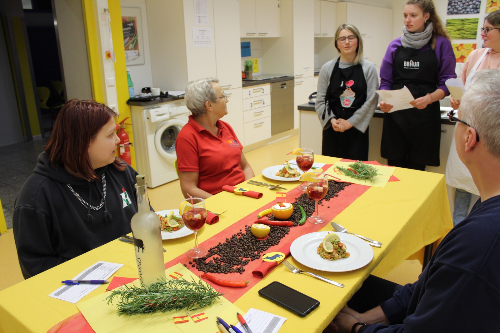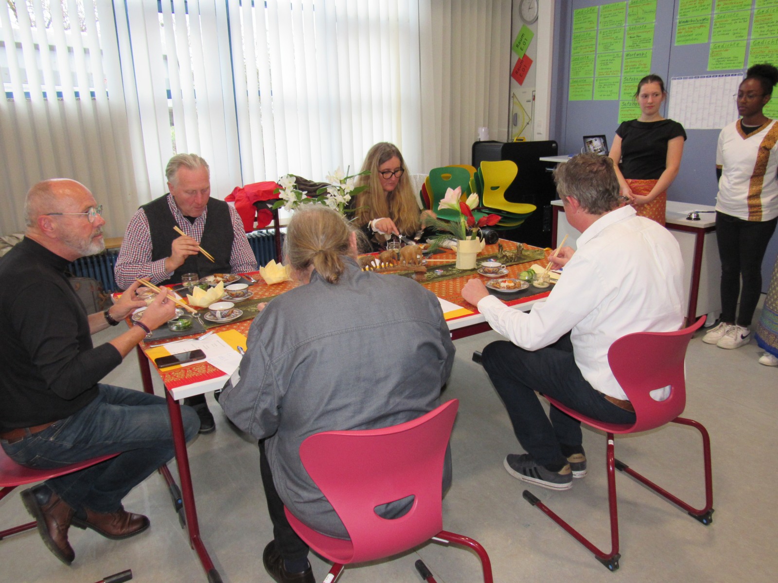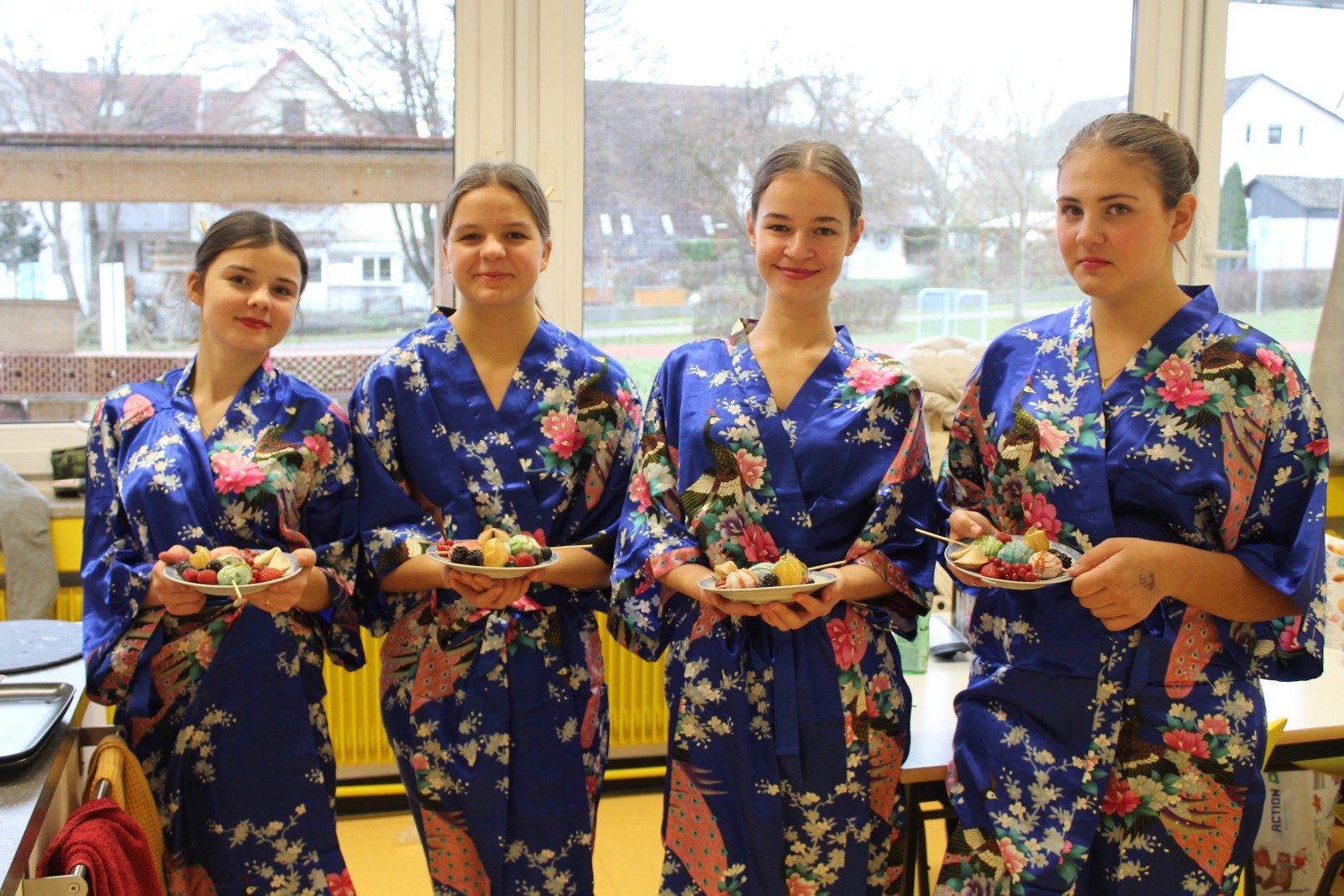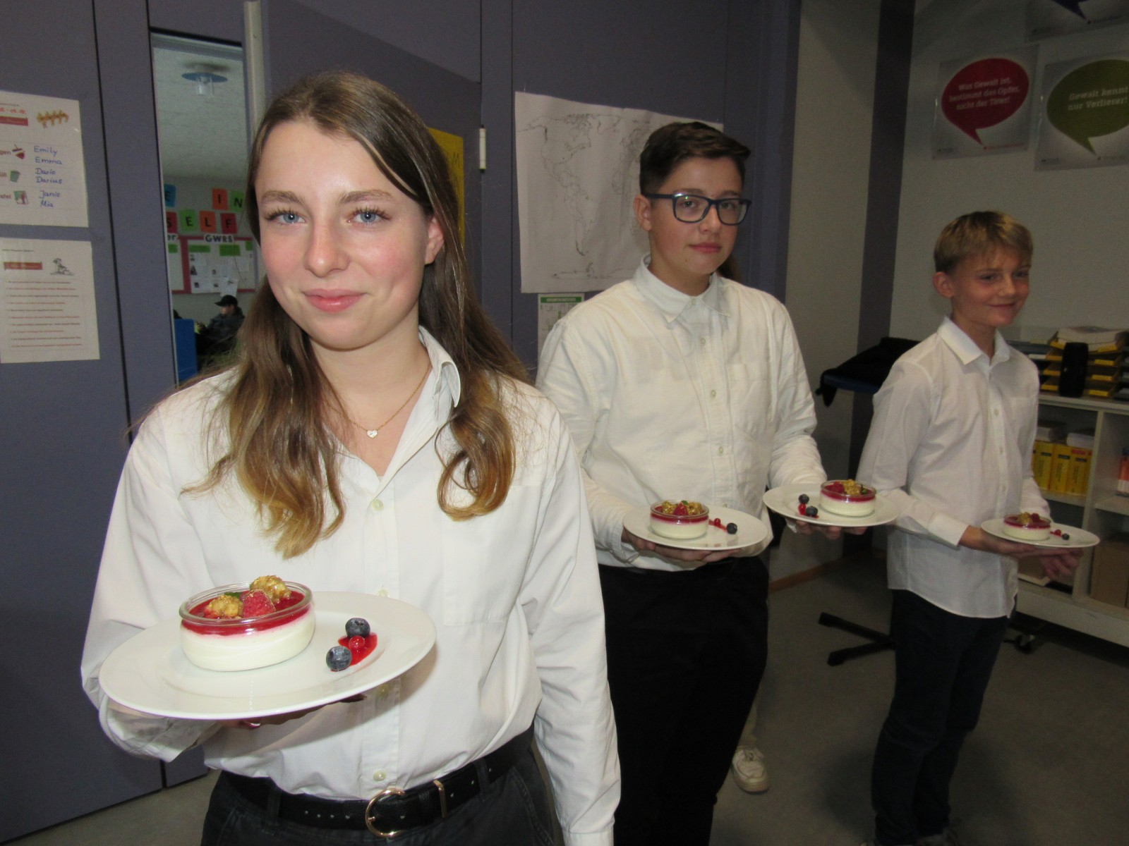 Im Vorfeld entscheiden die Teams mitsamt ihren Coaches, welches Land sie vertreten. Absolut zufrieden mit ihrer Wahl war das griechische Schulteam. Mit dem „leckeren griechischen Essen“ erreichten sie wie die Teams aus Thailand und Japan das Finale. An den Tischen warteten fünf Jurymitglieder. Darunter mit Pit Lang aus der Krone in Villingendorf und Wilhelm Maier vom Pflug in Rottweil zwei Profis. „Bei mir werdet ihr es schwer haben“, warnte Lang das Team Thailand. „Aber ich freu mich riesig, ich bin Thailandfan“. Enttäuscht wurde er nicht. Das Team heimste für seine Sommerrolle als Vorspeise, Karaage zur Hauptspeise und Kokosquark zum Nachtisch viel Lob ein und punktete mit Wissen zum Land und Kultur.