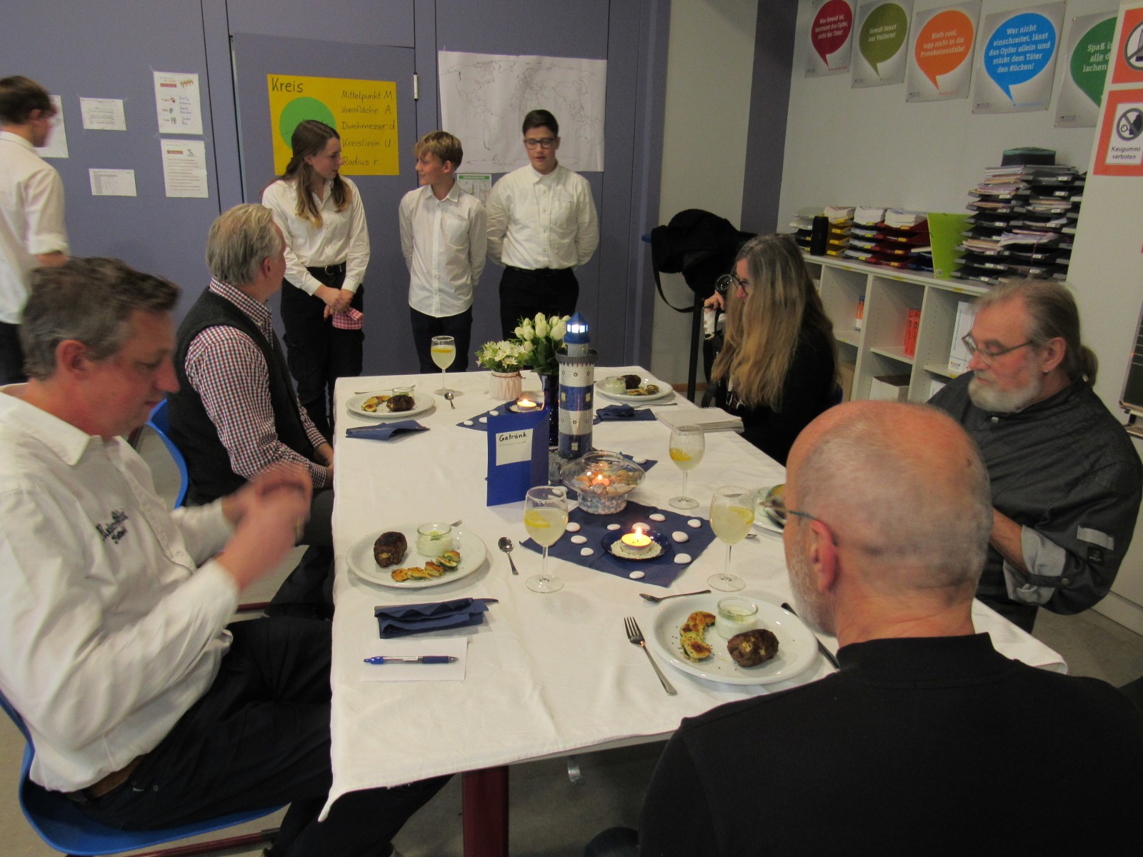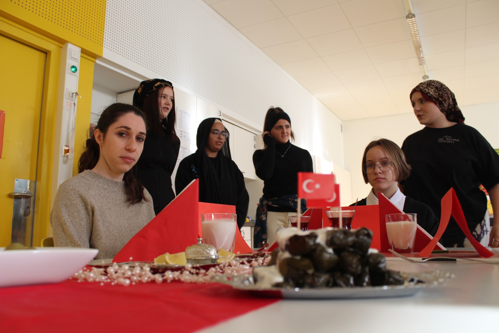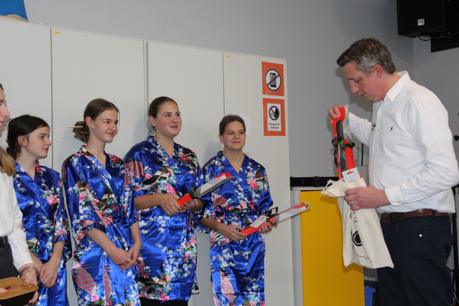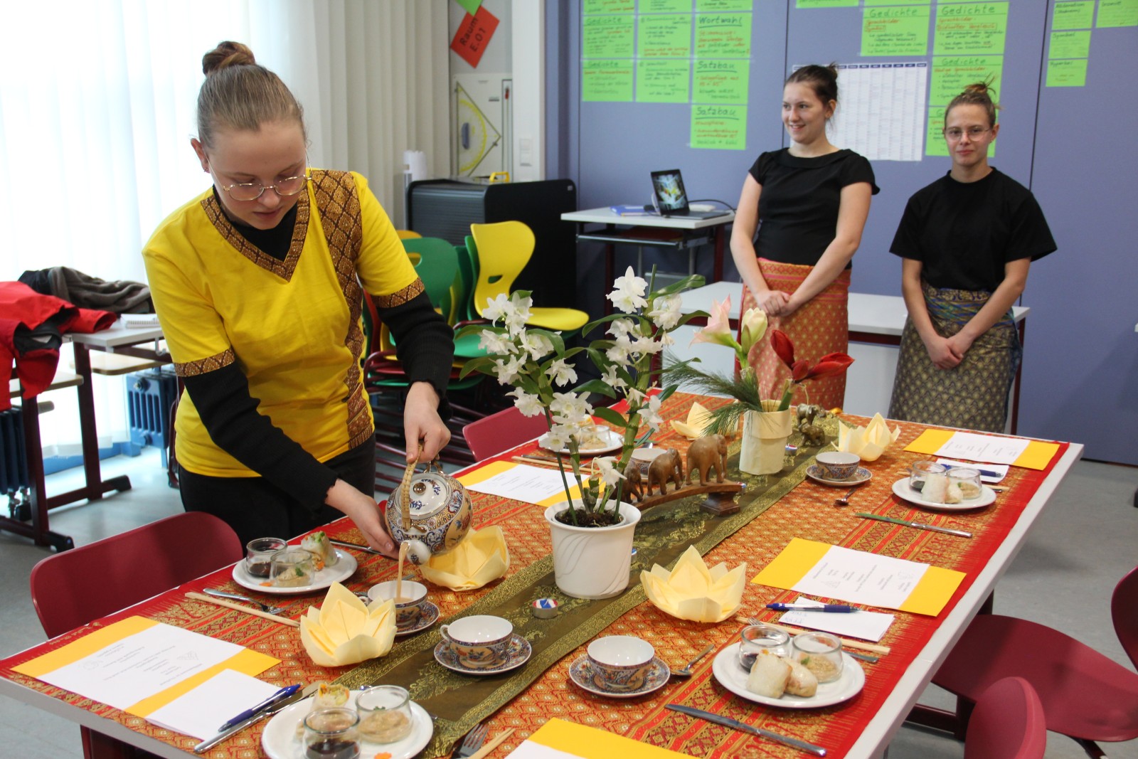 Im Vorfeld entscheiden die Teams mitsamt ihren Coaches, welches Land sie vertreten. Absolut zufrieden mit ihrer Wahl war das griechische Schulteam. Mit dem „leckeren griechischen Essen“ erreichten sie wie die Teams aus Thailand und Japan das Finale. An den Tischen warteten fünf Jurymitglieder. Darunter mit Pit Lang aus der Krone in Villingendorf und Wilhelm Maier vom Pflug in Rottweil zwei Profis. „Bei mir werdet ihr es schwer haben“, warnte Lang das Team Thailand. „Aber ich freu mich riesig, ich bin Thailandfan“. Enttäuscht wurde er nicht. Das Team heimste für seine Sommerrolle als Vorspeise, Karaage zur Hauptspeise und Kokosquark zum Nachtisch viel Lob ein und punktete mit Wissen zum Land und Kultur.