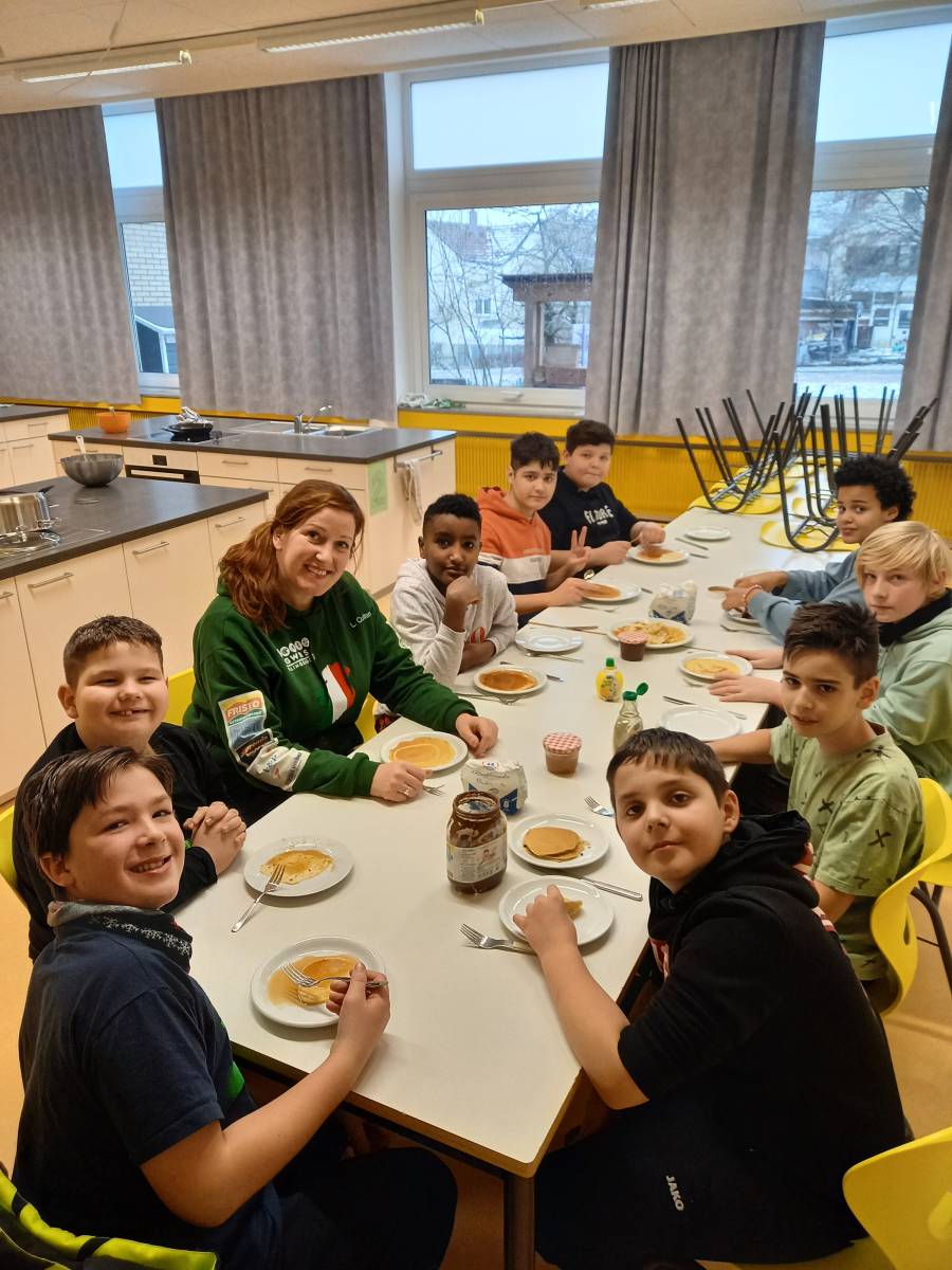 Spontan umentscheiden musste sich die Wandergruppe, weil das Wetter für spiegelglatte Wege gesorgt hatte. Dennoch kamen die Schülerinnen und Schüler in den Genuss von sportlichen Aktivitäten: Der Wandertag wurde kurzum in die Sporthalle verlegt, wo Ballspiele durchgeführt wurden. Und auch das zuvor geplante Grillen musste nicht gänzlich ausfallen, da in der Schulküche lecker Pancakes gebacken wurden.