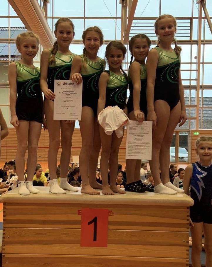 Am Reck, Schwebebalken, Boden und am Sprung zeigten die Mädchen durchweg hervorragende Leistungen, so dass sie am Ende des Wettkampftages mit einem 1. Platz im Kreisentscheid auf dem Siegertreppchen standen.