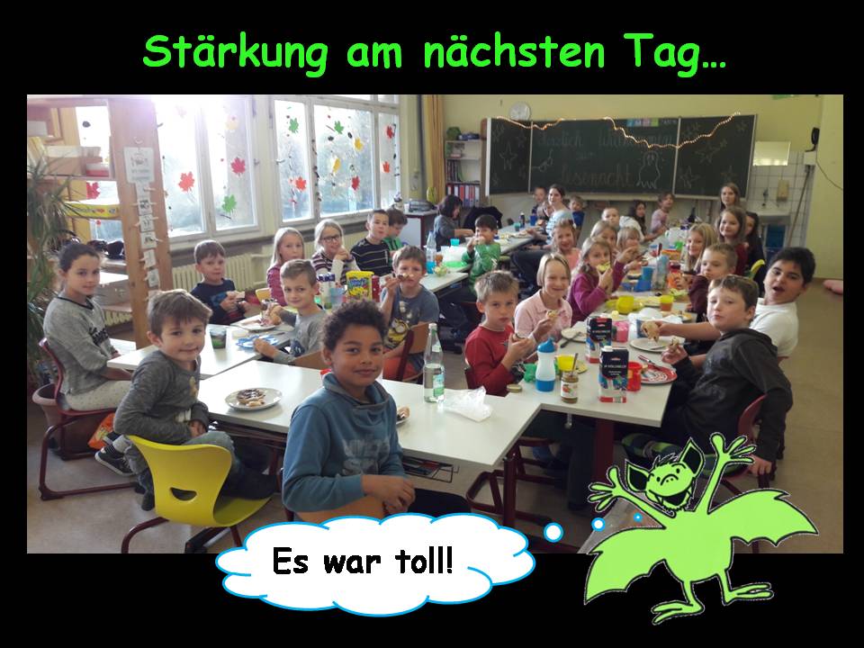 Durch leise Musik geweckt, stärkten sich die Kinder am nächsten Tag erst einmal bei einem ausgiebigen Frühstück. Trotz Schlafmangel waren sich die Schüler einig, dass die Schule eine gute Alternative zum eigenen Zuhause darstellt und die nächste Lesenacht schon bald stattfinden soll.