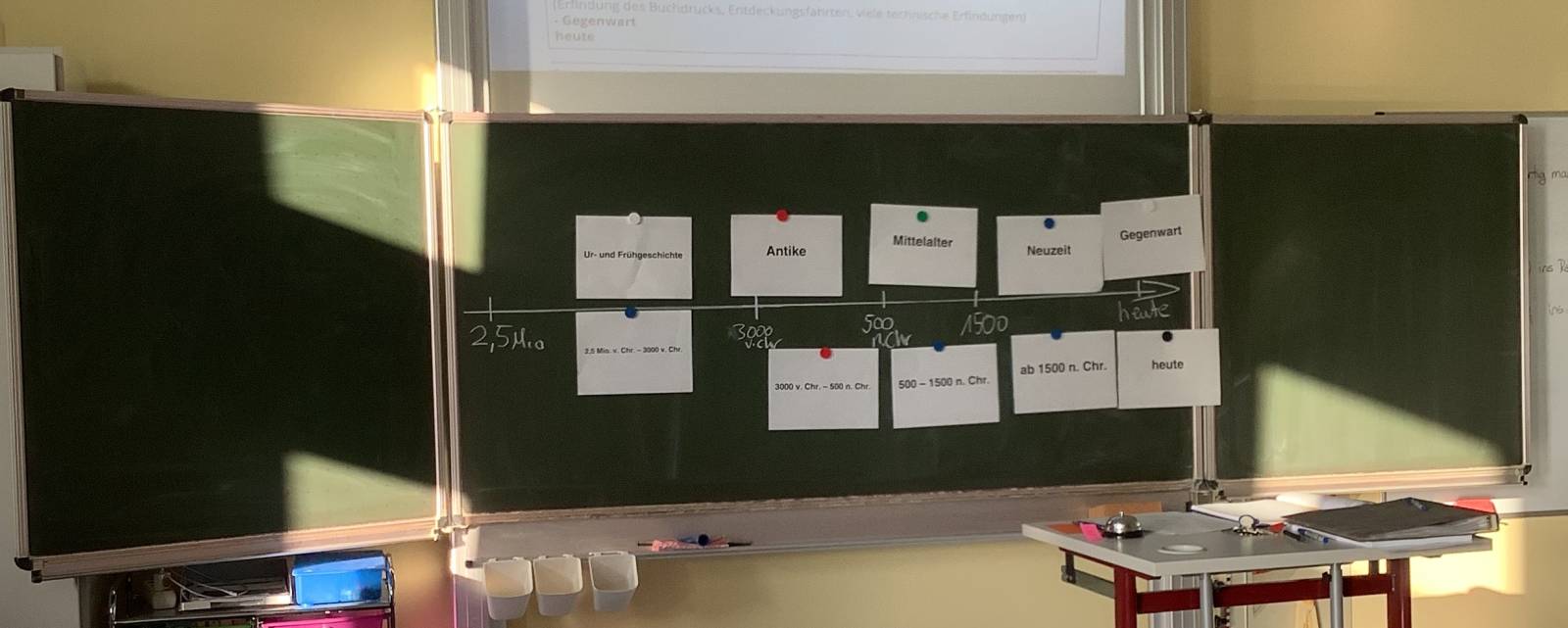Im Schuljahr 2025/2026 haben die Schülerinnen und Schüler der 5. Klassen ihre ersten Geschichtsthemen kennengelernt. Mithilfe eines Zeitstrahls sollten sie ein Gefühl für den Hintergrund der geschichtlichen Arbeit entwickeln. Zunächst durften die Kinder ihren eigenen Zeitstrahl gestalten und sich darüber austauschen. Anschließend wurden die verschiedenen Epochen gemeinsam im Plenum eingeordnet. Dabei konnten alle ihre Ideen und Vorstellungen einbringen.