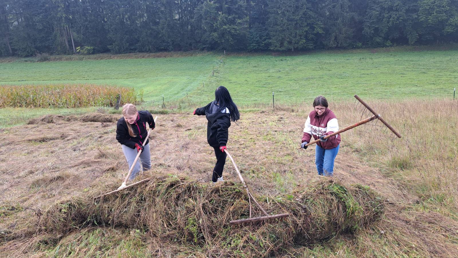 Nachdem nun Herr Weißer und sein Team die Wiesenabschnitte gemäht hatten, konnten die Schülerinnen und Schüler der Irlandklasse fleißig anpacken und mit viel Ausdauer und Durchhaltevermögen das Material von der Fläche rechen. Dieses wurde dann später vom örtlichen Landwirt abtransportiert.