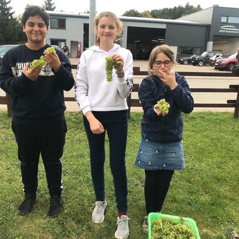 Als kreativ erwies sich in dieser Woche die Apfelklasse, die aufgrund der diesjährigen mageren Apfelernte auch zur Spende anderer Obstsorten aufgerufen hatte und gerne das Angebot annahm, Trauben zu ernten.