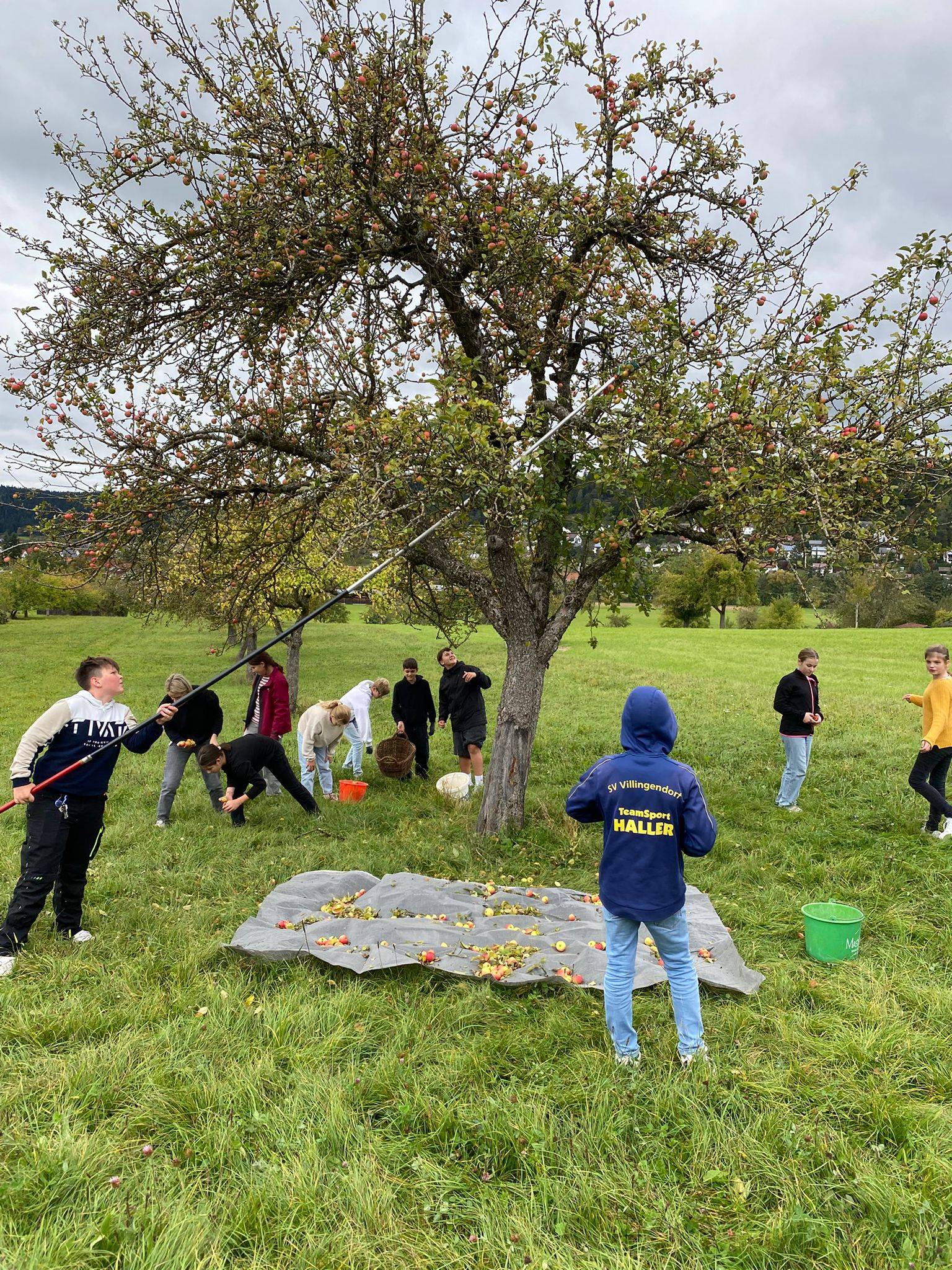 Diese Woche ist die Klassenstufe 6 mit großem Eifer dabei, Äpfel zu ernten. Mit Körben und Eimern ausgestattet, sammeln die Schülerinnen und Schüler die reifen Früchte von den Bäumen. Am Freitag werden die gesammelten Äpfel zur Mosterei Grimm in Villingendorf gebracht. Dort erleben die Kinder hautnah, wie aus den Äpfeln frischer Apfelsaft entsteht. Sie dürfen beim Pressen und Abfüllen mithelfen und erfahren dabei viel über die Herstellung und Verarbeitung regionaler Produkte.