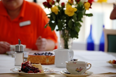 Beim Frühstück, das für jeden Bewohner individuell zusammengestellt wird, gibt es viel zu beachten: persönliche Vorlieben, Krankheitsbilder, die Form der Zubereitung und die jeweilige Mengendosierung. Außerdem werden zu den Mahlzeiten auch benötigte Medikamente gereicht. „Senioren und Servicekräfte kennen sich gegenseitig sehr gut“, staunte Zühlsdorff. Die umfangreichen Übersichtslisten seien von den Bediensteten vollständig verinnerlicht worden, sodass es zu keiner Zeit Hektik oder Unklarheiten gegeben habe. „Erst auf Basis dieser gut strukturierten und routinierten Abläufe gelingt der herzliche Umgang miteinander“, erläuterte Riedel. Sämtliche Lebensbiografien und familiären Verhältnisse müssten den Mitarbeitern natürlich bekannt sein, damit ein Austausch möglich werde, der sich nicht nur an der Oberfläche bewege. Und die Bandbreite ist weit: neben humorvollen Bemerkungen gibt es Unterhaltungen über Tagesthemen oder pragmatische Absprachen. Im Haus leben aber auch Senioren, die sich nicht mehr verbal mitteilen können. Einige von ihnen sind körperlich zudem stark geschwächt. Hier sind neben den gesprochenen Worten weitere Formen der Zuwendung besonders wichtig: Mimik, Gestik und sorgfältig bedachte Berührungen. „Während der Kontaktaufnahme musste ich mich ausschließlich auf mein Gegenüber konzentrieren, um folgen zu können“, reflektierte Zühlsdorff seine Begegnungen. Es sei bewundernswert, wie die Mitarbeiter stets auf alle anwesenden Personen eingehen und reagieren konnten.