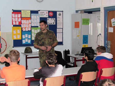 Oberleutnant Markus Bayer informierte die 8. und die 10. Klasse über den größten Arbeitgeber Deutschlands - die Bundeswehr.