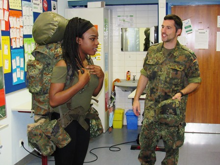 Nach dem interessanten Vortrag und unzähligen Fragen, die Herr Bayer mit viel Humor beantwortete, durfte eine Schülerin die Ausrüstung eines Soldaten anlegen und stellte fest, dass man ganz schön fit sein muss, um den großen Rucksack und die anderen Sachen tragen zu können.
