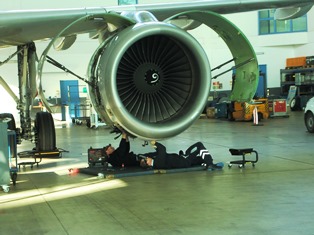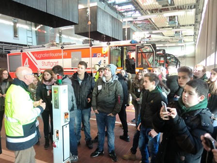 Im Anschluss folgte die direkte Anschauung in Form einer Flughafenführung. Sicherheitskontrolle, Abfertigungsbereiche, Rollfeld, Winterdienst und Gepäcklogistik. Im Gebäude der Flughafenfeuerwehr gab es Einsatztrucks zu bestaunen, deren Raddurchmesser so manche Schülerlänge überragte. Tonnenschwere Kolosse, die mithilfe von Panzermotoren jeden Winkel des Flughafengeländes innerhalb von nur zwei Minuten erreichen können. Die Löschleistung dieser Fahrzeuge lässt sich mit nichts vergleichen, was die Schüler aus den Feuerwehrmagazinen ihrer Heimatorte gewohnt sind – alles eben eine Nummer größer hier. In einer riesigen Wartungshalle der Lufthansa durften wir uns dann frei bewegen: Cockpit erkunden, Turbinen umrunden, den Technikern über die Schulter schauen, unter dem Bauch mächtiger Langstreckenflieger stehen und das Kabelgewirr der elektrischen Infrastruktur solcher Maschinen bestaunen. Faszination und Spannung pur. Dafür wurde dann gerne in Kauf genommen, dass wir erst einen Zug später heimwärts gen Rottweil nehmen konnten.