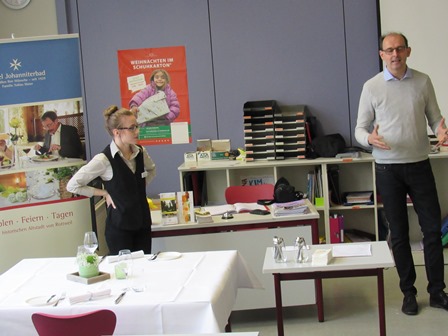 Anhand eines schön gedeckten Tisches erklärte Christine, dass es in einem guten Restaurant nicht nur auf die Bereitstellung eines feinen Essens ankommt, sondern auch um das „Drumherum“: Beratung, zuvorkommende Bedienung, Präsentation des Essens usw., also auf die Pflege von „Tischkultur“.