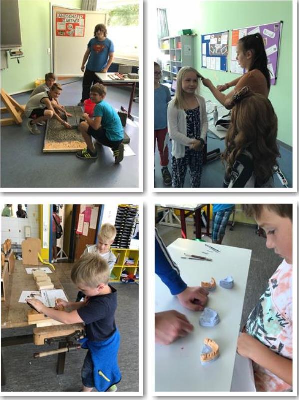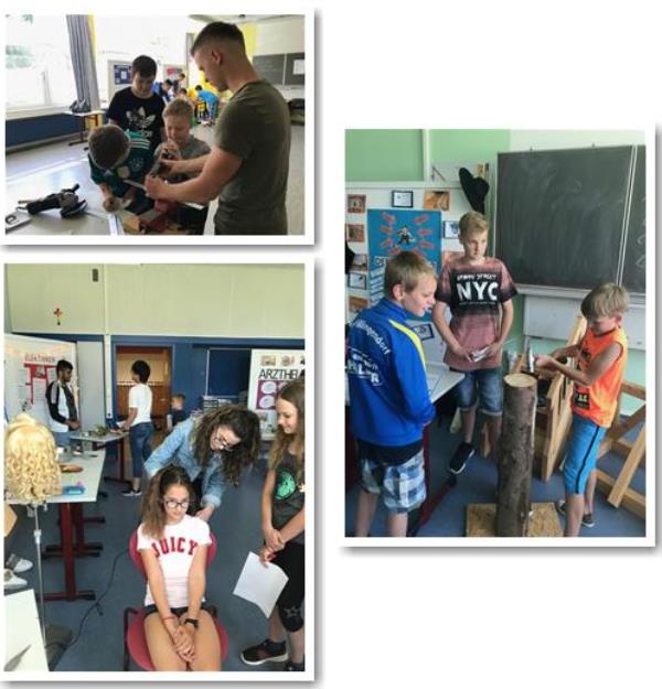 An 26 Messeständen konnten sich die Viertklässlerlässler diese Woche ausgiebig über verschiedene Berufsfelder informieren und bei zahlreichen Aktivitäten selbst Hand anlegen. Die Neuntklässler hatten sich wochenlang mit einer kindgerechten Gestaltung eines eigenen Messestandes befasst und sich zur Aufgabe gemacht, den Grundschülern einen erkundeten Beruf altersgerecht zu präsentieren und eine zum Berufsbild passende Aktivität anzubieten.