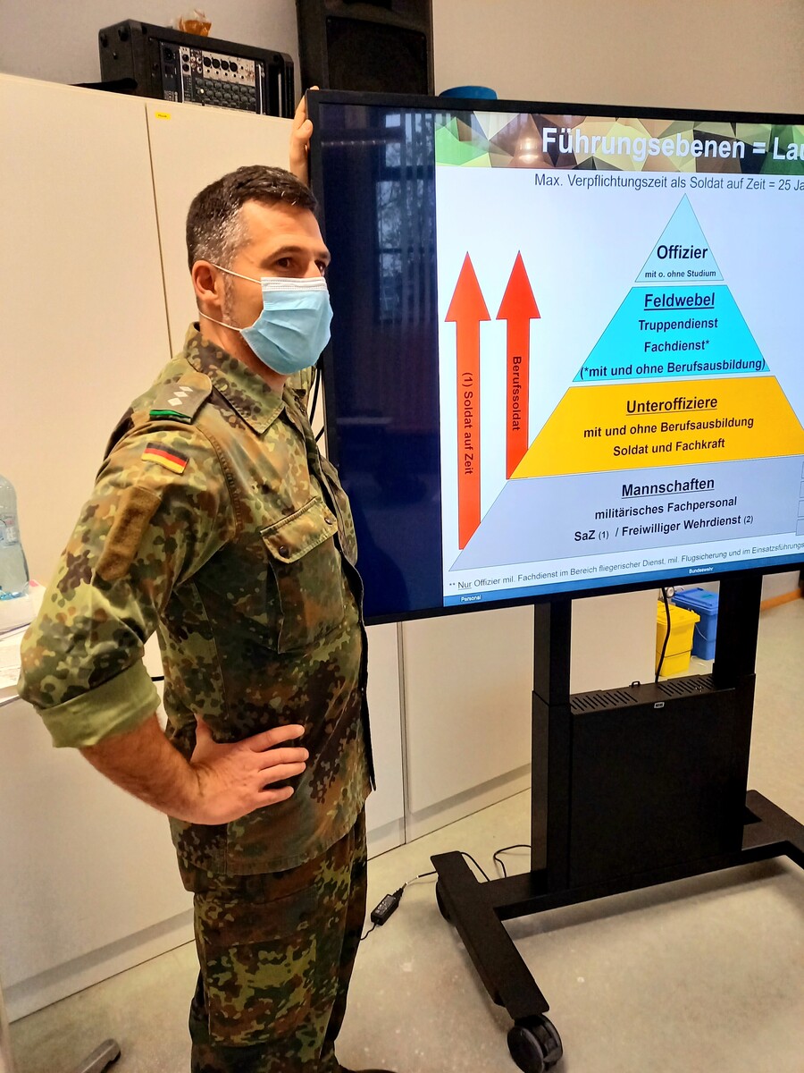 Markus Bayer eröffnete heute in den Klassenstufen 9 und 10 den diesjährigen Reigen der Ausbildungsbotschafter und zeigte auf, welche beruflichen Möglichkeiten in zivilen sowie militärischen Bereichen der Bundeswehr bestehen. Thematisiert wurden dabei auch die Rolle der Streitkräfte als Parlamentsarmee und das staatliche Gewaltmonopol. Unter dem Dach der Bundeswehr sind über 50 verschiedene Berufsbilder möglich.