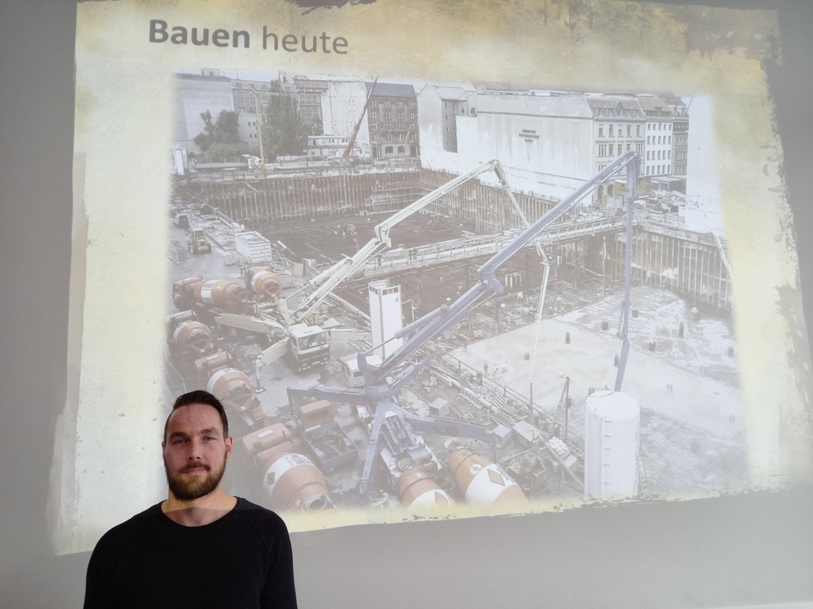 Zusammen mit dem aufmerksamen jungen Plenum zeigte Lehner, wie sich durch den Einsatz großer Baumaschinen und mithilfe von modernen Bautechniken die Arbeit der Baufacharbeiter erheblich geändert hat. Seit 1994 stehen sämtliche Bauberufe auch Mädchen offen, weil die körperliche Belastung durch diverse Hilfsmittel deutlich reduziert werden konnte. Der technische Wandel hat zudem die Inhalte der Bauberufe grundlegend verändert: Baufacharbeiter brauchen heute vor allem technisches Know-how. Schwere Steine, die früher durch Muskelkraft an ihren Bestimmungsort gelangt waren, werden nun durch kleine Spezialkräne „spielend leicht“ bewegt.