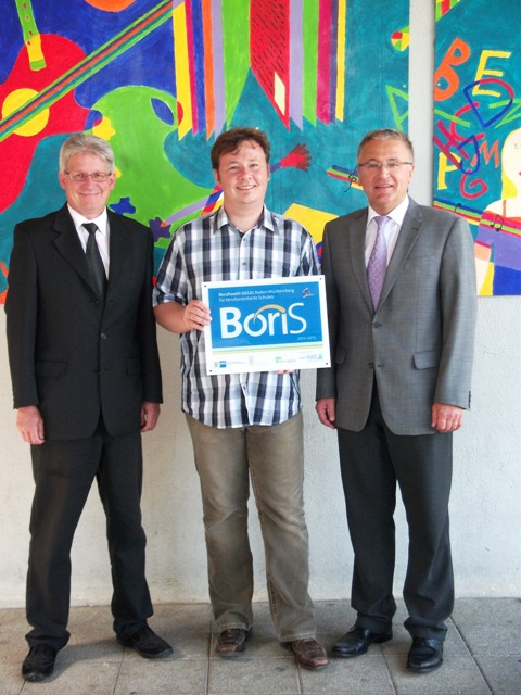 Alexander Fritz von der Industrie- und Handelskammer Schwarzwald-Baar-Heuberg konnte das Berufswahlsiegel „BoriS“ an die Villingendorfer Schule, die im Frühjahr eine Zertifizierung inklusive eines Audits erfolgreich absolvierte, verleihen. Schulleiter Rainer Kropp-Kurta freute sich zusammen mit Bürgermeister Karl-Heinz Bucher über die Auszeichnung. Fritz beschied der neuen Grund- und Werkrealschule ein außergewöhnlich gutes Konzept in der Berufsorientierung mit zahlreichen Kooperationen mit Betrieben, Schülerfirmen, internen Wettbewerben und Unterstützungsmechanismen, die alle Schülerinnen und Schüler erfolgreich auf ihrem Weg von der Schule in die Ausbildung und das Berufsleben begleiten würden. Die Zertifizierung gilt zunächst bis 2015. Kropp-Kurta freut sich schon auf neue Projekte im Bereich Berufsorientierung und weitergehende Zusammenarbeit, beispielsweise mit Banken im kaufmännischen Bereich.