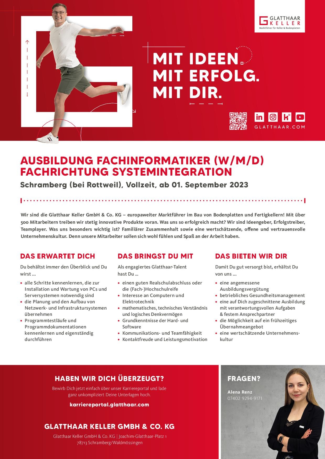 Die Firma Glatthaar Keller GmbH & Co.KG aus Schramberg-Waldmössingen, Partner in der beruflichen Orientierung auf unserer map of jobs, bietet aktuell noch einen höchst interessanten Ausbildungsplatz als Fachinformatiker (w/m/d) Fachrichtung Systemintegration an. Weitere Infos: https://www.schule-villingendorf.de/werkrealschule/berufsorientierung/map-of-jobs/123-glatthaar-fertigkeller-gmbh-co-kg.html oder anbei.