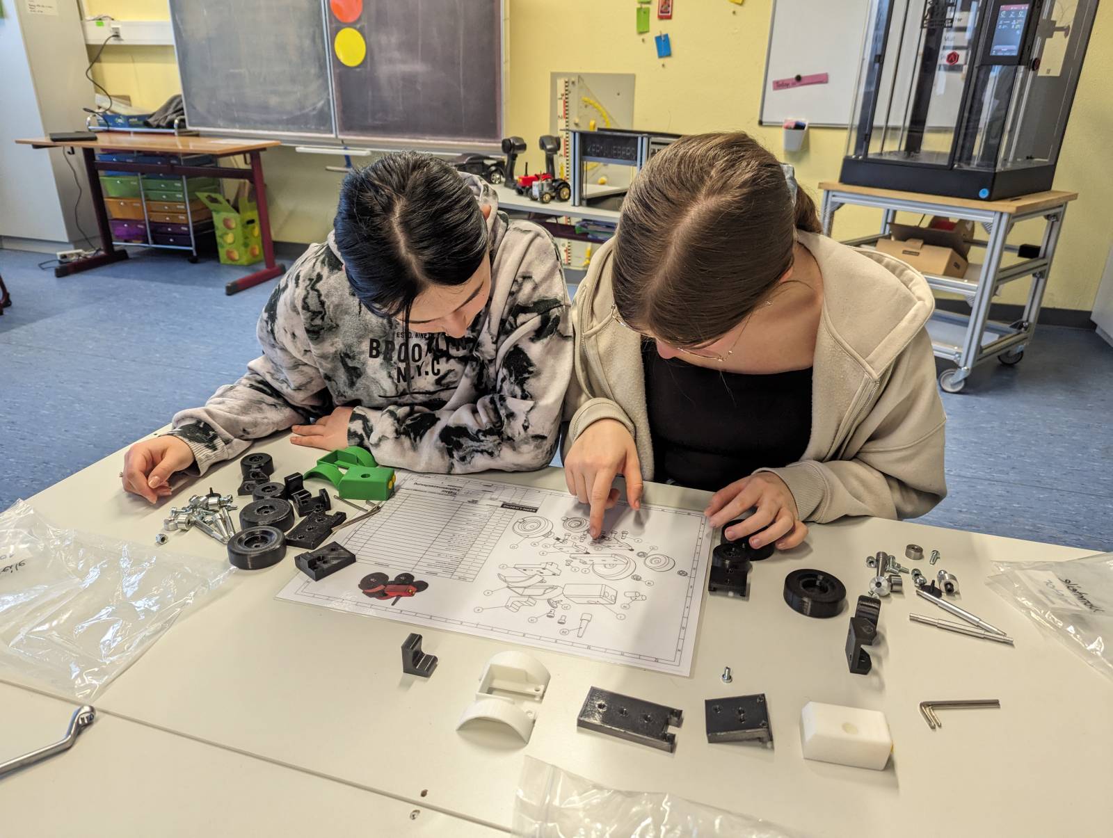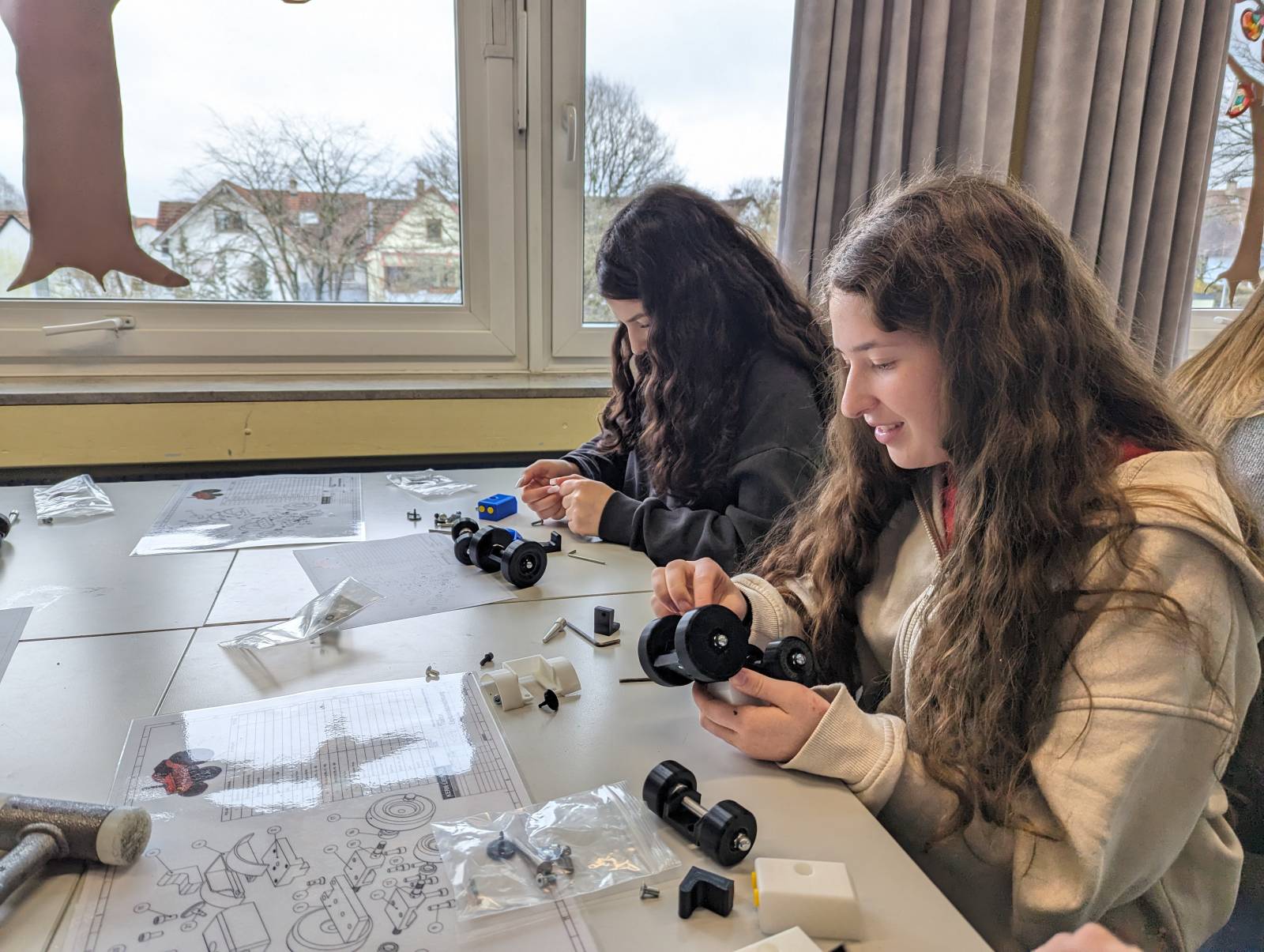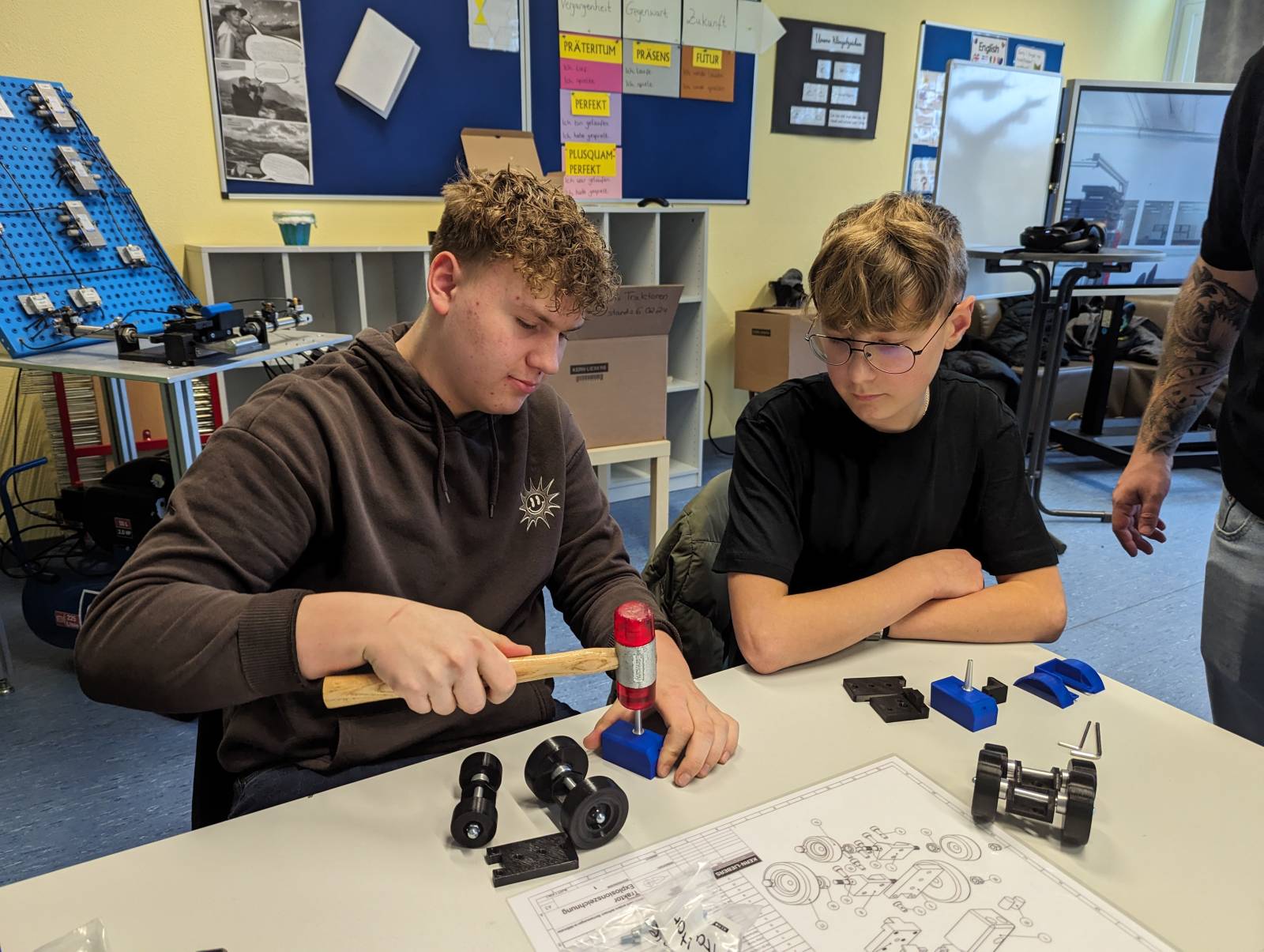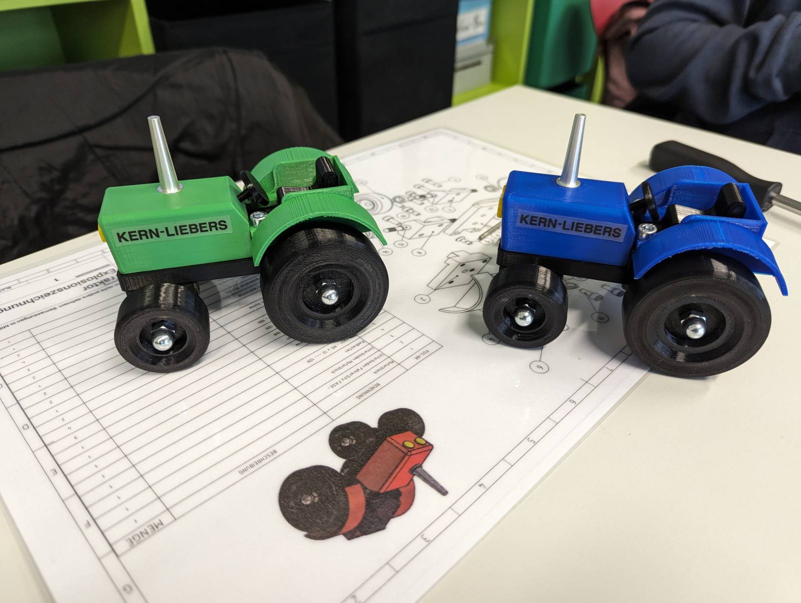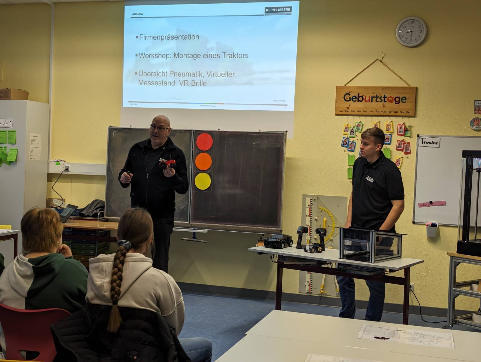 Im zweiten Teil konnten die Schülerinnen und Schüler ins aktive Tun übergehen. Hierzu erhielt jeder Schüler einen Bausatz für einen Traktor, der zuvor von den Auszubildenden entworfen und entwickelt sowie im 3D-Drucker gedruckt wurde. Mit Hilfe einer technischen Zeichnung, die ebenfalls von den Auszubildenden angefertigt wurde, musste nun jeder Schüler den Traktor mittels verschiedenem Werkzeug zusammenbauen. Unterstützt wurden die Jugendlichen hierbei von 6 Auszubildenden, die sich derzeit überwiegend im zweiten Lehrjahr bei Kern-Liebers befinden. So ergab sich eine Win-Win-Situation: die Schüler lernten von den Auszubildenden und die Auszubildenden konnten sich darin üben, andere anzuleiten und den selbst entworfenen und hergestellten Bausatz anschließend reflektieren und weiter optimieren. Alle Beteiligten waren aktiv involviert und hatten Freude am Tun. Nachdem die Jugendlichen fertig waren, hatten sie noch die Gelegenheit, zu beobachten, wie ein 3D-Drucker funktioniert, eine von Azubis selbst hergestellte Pneumatik-Schaltung bestaunen, sowie mittels VR-Brille die Auszubildendenlehrwerkstatt bei Kern-Liebers bestaunen. Bitzer betonte, wie wichtig Spaß an der Arbeit sei und erklärte ebenfalls, weshalb es für einen Betrieb unabdingbar sei, in die Ausbildung zu investieren und sie innovativ immer weiterzuentwickeln.