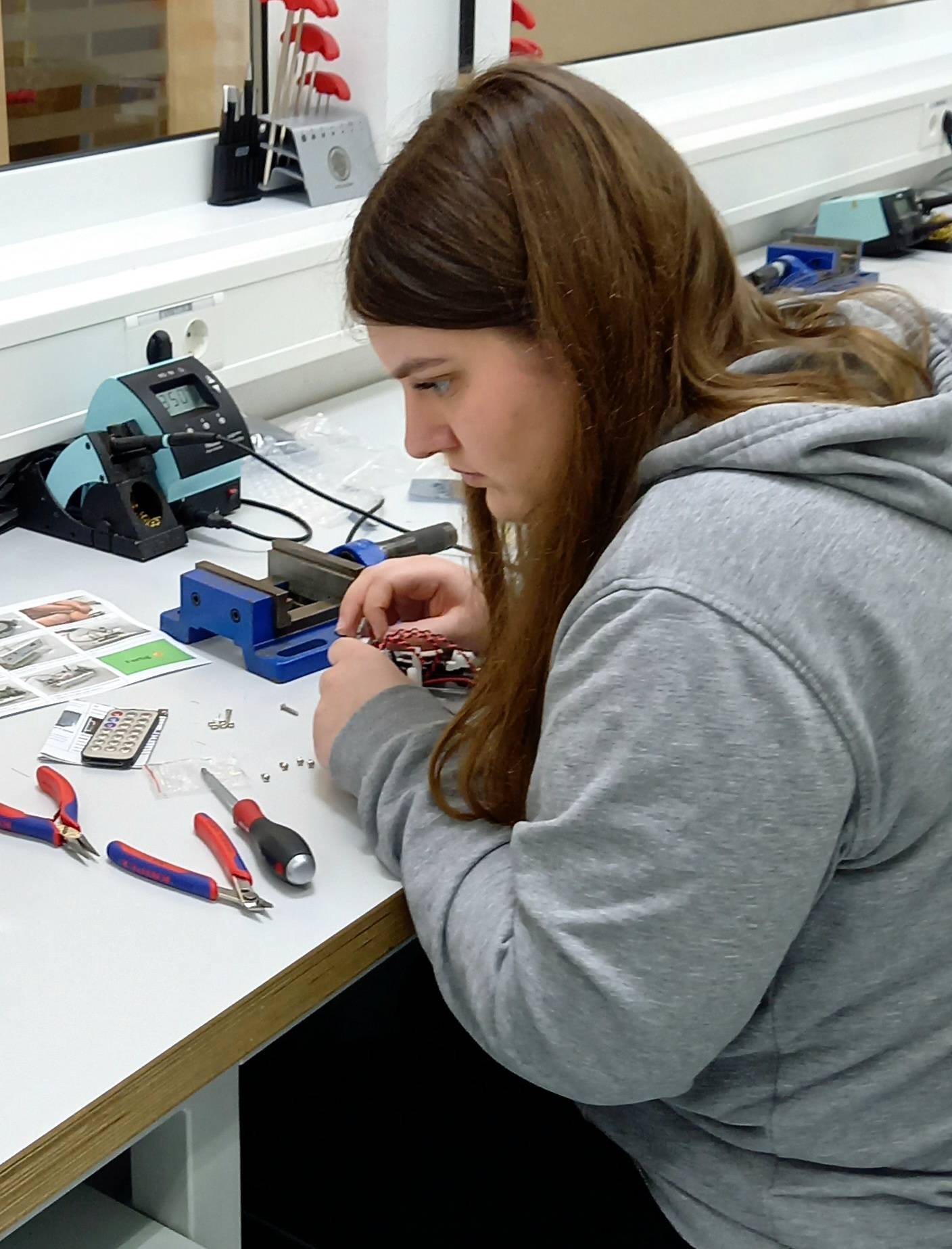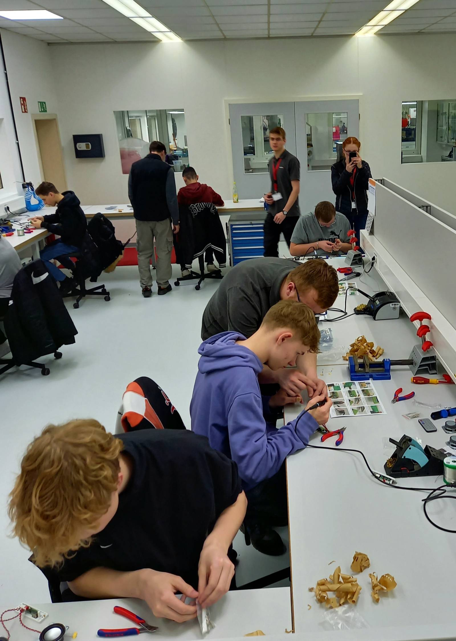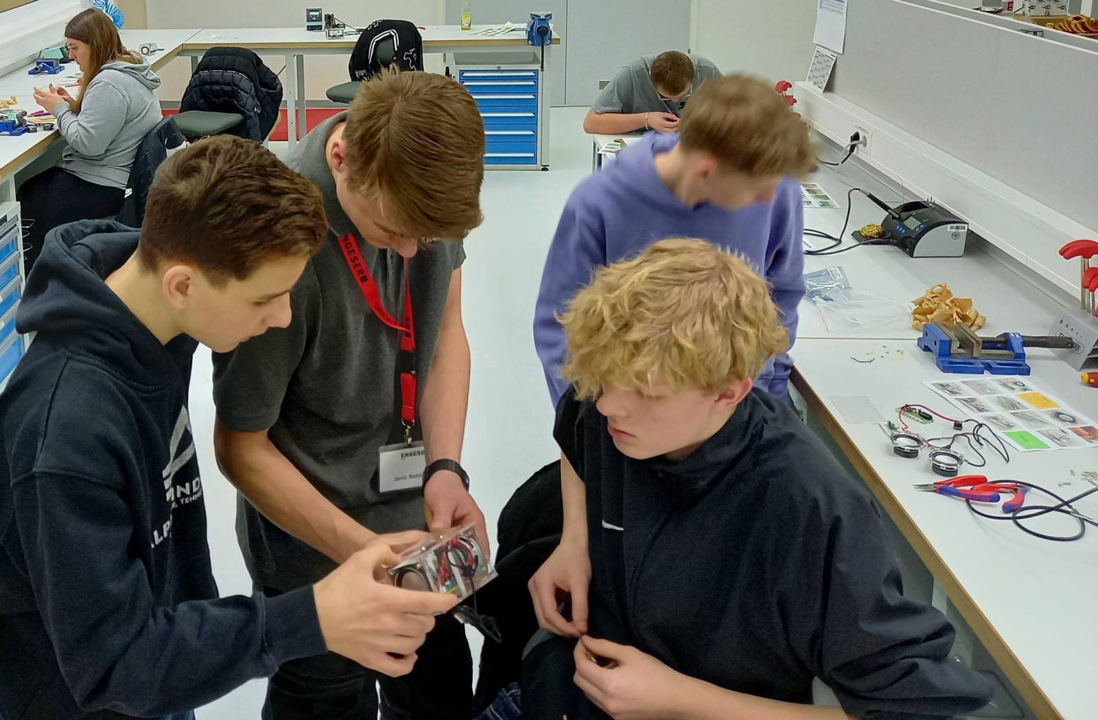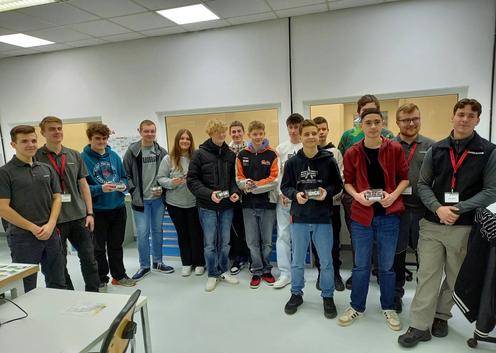 In kleinen Gruppen, jeweils begleitet von einem Azubi, wurde zunächst der Betrieb erkundet. Dabei verschafften sich die Jugendlichen einen Überblick zu allen Bereichen des Unternehmens. Im Anschluss starteten die Workshops. Verantwortet und begleitet wurden diese kompakten Praxis-Projekte erneut von kompetenten Azubi-Teams, die sich mit größtem Engagement und ganz viel Herzblut um die „Neuner“ kümmerten. Alle vier Workshops boten spannende praktische Aktivitäten, die umfangreiche Einblicke in das jeweilige Berufsbild ermöglichten. Zudem basierte das gemeinsame Tun auf Interaktionen und den beständigen Austausch mit den beteiligten Azubis. So konstruierten die Jugendlichen im Mechatronik-Workshop beispielsweise raffinierte Bluetooth-Boxen, die sie am Ende über ihre Mobiltelefone sofort testen und in Betrieb nehmen konnten.