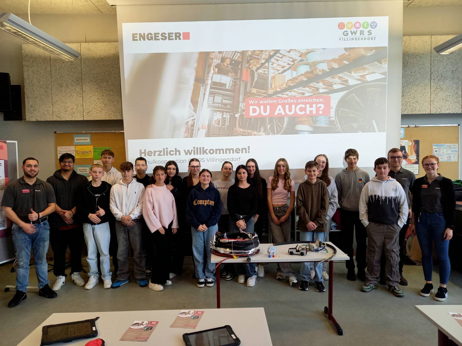 Mit Larissa Hirt, Artur Hakobyan und Robin Seeger besuchten nun drei Ausbildungsbotschafter von der Engeser GmbH die Schülerinnen und Schüler der Klassenstufe 9. Kurzweilig stellten sie die Ausbildungsberufe Maschinen- und Anlagenführer, Mechatroniker, Industriekaufmann sowie Fachkraft für Lagerlogistik (alle m/w/d) vor. Zudem warben die Azubis für ihre Praxisworkshops, die während eines Vormittags in den Gebäuden der Engeser GmbH in Waldmössingen geplant sind. Für jedes der genannten Berufsbilder soll es dann ein eigenes Programm geben. „Wenn dich eines dieser Berufsbilder interessiert, freuen wir uns auf dich“, motivierte Hirt die Jugendlichen zur Teilnahme am zweiten Teil des Projekts. Über ein onlinebasiertes Quiz zeigten die Jugendlichen zum Abschluss, dass sie zuvor aufmerksam mitgearbeitet hatten. Das spannende „Ringen“ um die vorderen Plätze im Echtzeitranking sorgte für großen Spaß. Bis zum Ende der Woche ordnen sich die Schülerinnen und Schüler auf Wunsch einem der vier Praxisworkshops zu. Der Transfer von Villingendorf nach Waldmössingen wird von der Engeser GmbH übernommen.