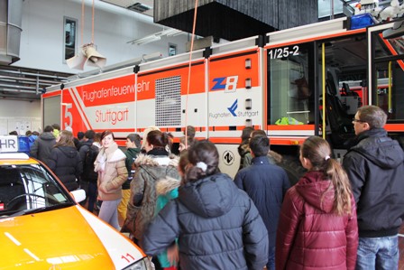 Am nächsten Morgen gab es ein großes Büfett zum Frühstück. Nach dem Frühstück fuhren wir mit der S-Bahn zum Flughafen Stuttgart, wo wir uns mit Herrn Zühlsdorff und den 9. und 10. Klässlern trafen. Herr John, ein Mitarbeiter des Stuttgarter Flughafens, erzählte uns spannende Sachen über den Flughafen. Auch über die vielen Berufe, die am Flughafen vertreten sind, lernten wir viel. Aufschlussreich war auch das Bewerbungsverfahren und so manche Geschichte aus seiner Erfahrung. Danach wurden wir auf dem Flughafengelände herum geführt. Wir durften auf das Rollfeld, mussten aber davor durch die Sicherheitskontrolle. Auch die Flughafenfeuerwehr durften wir bewundern. So machten wir uns gegen 16.00 Uhr auf den Weg nach Hause.