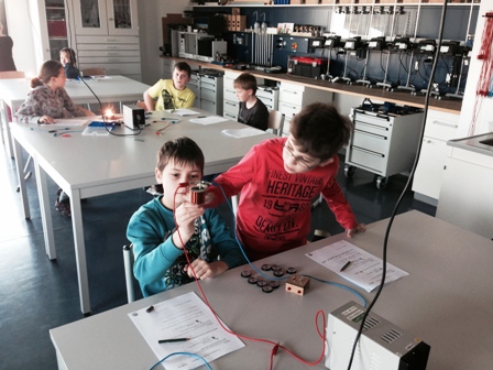 Am 12. März 2014 war es endlich soweit. Der langersehnte Ausflug nach Heilbronn in die Experimenta startete bereits um 7.00 Uhr. Mit einem Bus voller gutgelaunter Schülerinnen und Schüler kamen wir pünktlich um 9.30 Uhr zu unserem Workshop „Rund um die Elektrizität“ an. Dort brachten die Fünft- und Sechstklässler mit Hilfe eines Stromkreises Lampen mit unterschiedlichen Materialien zum Leuchten.