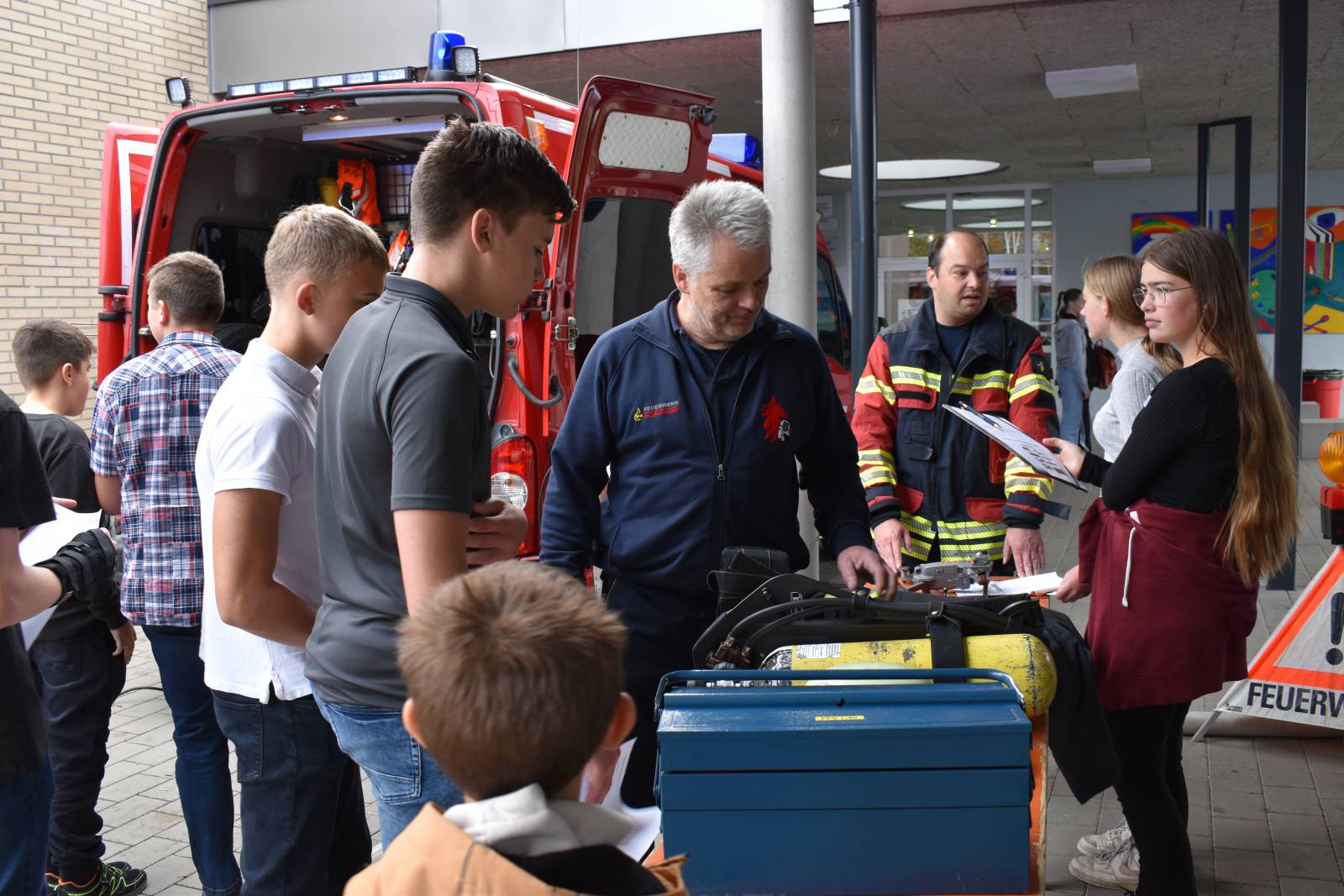 Vor dem Eingangsbereich präsentiert sich die freiwillige Feuerwehr Villingendorf mit Einsatzwagen und Löschgerätschaften – natürlich handlungsorientiert und zum Ausprobieren. Denn auch das ehrenamtliche Engagement kann für die berufliche Karriere förderlich sein und ist in unserer Gesellschaft unverzichtbar.