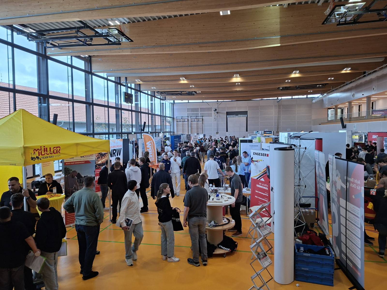 66 ausstellende Unternehmen und Institutionen präsentierten sich am 23. Oktober 2025 den zahlreichen Besuchern in der Villingendorfer Mehrzweckhalle sowie auf dem Schulcampus. Die elfte Ausgabe des RBF überzeugte durch ein breites Teilnehmerfeld aus nahezu allen wirtschaftlichen Bereichen. „Das Berufsforum folgt seit Anbeginn einem besonderen Profil“, erklärte Lehrer Torsten Zühlsdorff, der an der GRS Villingendorf zusammen mit seinem Kollegen Joachim Mauerlechner die Berufsorientierung koordiniert. So sei der Messetermin wenige Wochen nach Beginn des Schuljahres sorgfältig gewählt, damit die Heranwachsenden auf ihrer Suche nach Praktika und beruflicher Ausbildung entsprechende Kontakte knüpfen können. Sämtliche Aussteller stammen aus der Region, was von besonderer Bedeutung sei, da die meisten Jugendlichen auf die Nutzung des öffentlichen Nahverkehrs angewiesen sind. „Unsere Partner kommen zudem mit großer Personalstärke vor Ort, von ihren Azubis bis hin zu wichtigen Entscheidungsträgern“, führte Zühlsdorff weiter aus, was die Kommunikation und den Austausch extrem vereinfache. Oft seien bereits direkt am Stand konkrete Vereinbarungen möglich. Zudem zeichnen sich die Auftritte vieler Unternehmen durch spannende Mitmachangebote aus, was auf das junge Publikum besonders anziehend wirke, ergänzte Mauerlechner.