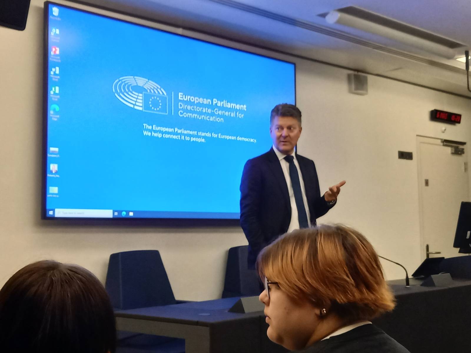 Im Anschluss fuhren die „9er“ auf Rolltreppen an Medienbereichen vorbei in den großen Plenarsaal. Auf der Besuchertribüne folgten sie einer laufenden Debatte, bei der es um den Binnenmarkt und mögliche Reaktionen auf die US-Zölle ging. Über Kopfhörer konnte die Simultanübersetzung der Redebeiträge verfolgt werden. Dabei wurde deutlich, dass dieses Thema zu sehr unterschiedlichen Meinungen führt - die Debatte zeichnete sich durch mitunter emotional-kontroverse Beiträge aus.