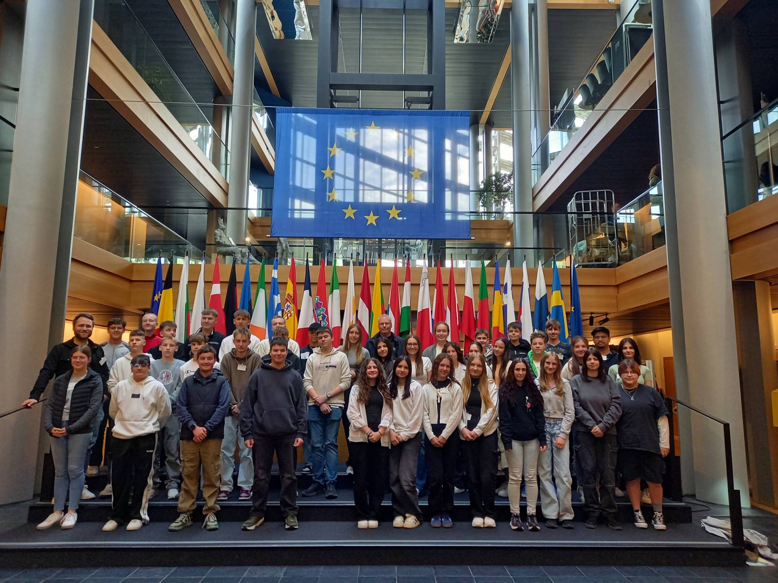 Die Jugendlichen konnten sich zunächst einen Eindruck von den Innenräumen machen: 1133 Büros, 18 Sitzungssäle, große Medienbereiche für Interviews und Berichterstattung sowie der riesige Plenarsaal mit einem Fassungsvermögen von 750 Plätzen. In einem Raum für Ausschusssitzungen kam es dann zur Begegnung mit Schwab. Die Schülerinnen und Schüler zeigten sich gut vorbereitet und stellten kritische Fragen zu Themen wie Krieg in der Ukraine, Energiewende, Elektromobilität, Stabilität des Euro, Einführung des digitalen Euros sowie zum politischen Alltag in Brüssel und Straßburg. Während des lebhaften Austausches führte Schwab die Positionen seiner Fraktion aus. Ein gemeinsames Foto vor den Flaggen aller 27 Mitgliedsstaaten rundete diese Begegnung schließlich ab.