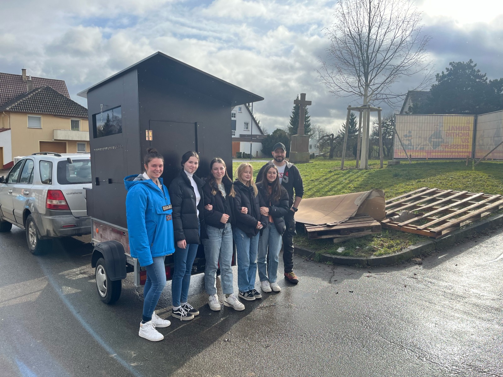 Nach einem kleinen Zwischenfall (der Hänger wollte nicht mehr von der Anhängerkupplung) konnten wir den Stall dann endlich auf dem Schulgelände parken. Die Freude darüber ist riesig und der Einzug der Schulhühner rückt nun noch näher!