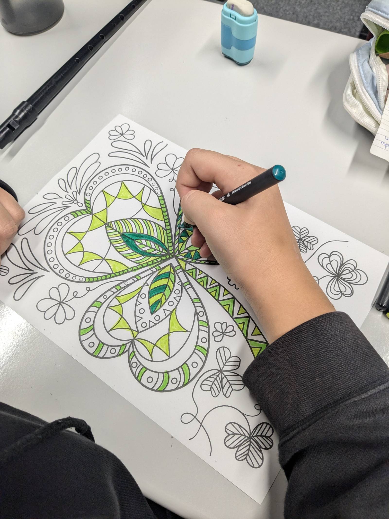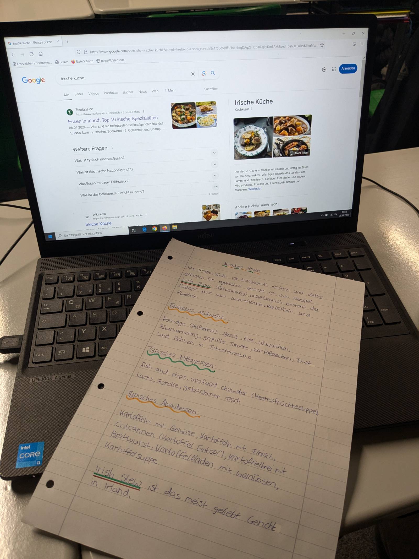 Am Irlandmittag tauchten die Siebtklässler kreativ in die Kultur der grünen Insel ein und gestalteten ihr ganz persönliches Kleeblatt – natürlich mit den charakteristischen irischen Farben. Einige Schülerinnen und Schüler entschieden sich sogar, ihrem Werk eine rein irische Note zu geben. Nach der künstlerischen Gestaltung ging es weiter in die Recherche: In Kleingruppen erarbeiteten die Schülerinnen und Schüler spannende Fakten zu irischen Themen wie Traditionen, Musik und Kulinarik. Mit großem Interesse vertieften sich die Jugendlichen in ihre Themen, sammelten Informationen und notierten ihre Erkenntnisse. Doch dies ist nur der Anfang: In den kommenden Wochen werden die Schülerinnen und Schüler noch viel Neues über Irland erfahren und gemeinsam entdecken, was die grüne Insel so besonders macht.