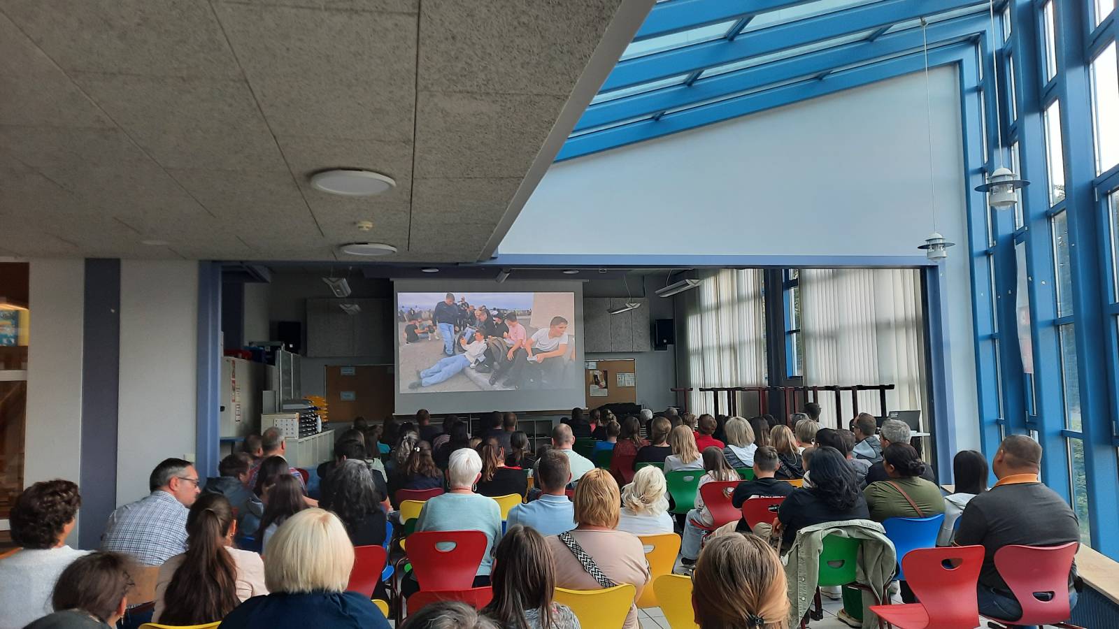 Im Rahmen des irischen Abends konnten die Schülerinnen und Schüler der Irlandklasse nochmals am 29.07.2025 in Erinnerungen an ihre Irlandreise schwelgen. Rund 80 Zuschauer, bestehend aus den Siebtklässlern, deren Eltern, Geschwistern, Großeltern und weiteren Interessierten als auch den Klassenlehrern Lynda Cullen, Kyra Kühnert und Monja Suhm sowie den Begleitlehrern Birgitt Schlieter und Joachim Mauerlechner, bestaunten den von der Lehrerin Monja Suhm erstellten einstündigen Film aus Fotos und Videos von der Reise. Ein tolles Jahr mit vielen wertvollen Erfahrungen und einer genialen Reise geht für die Siebtklässler nun zu Ende und sie können gespannt auf die bevorstehende Kompassklasse im achten Schuljahr blicken.
