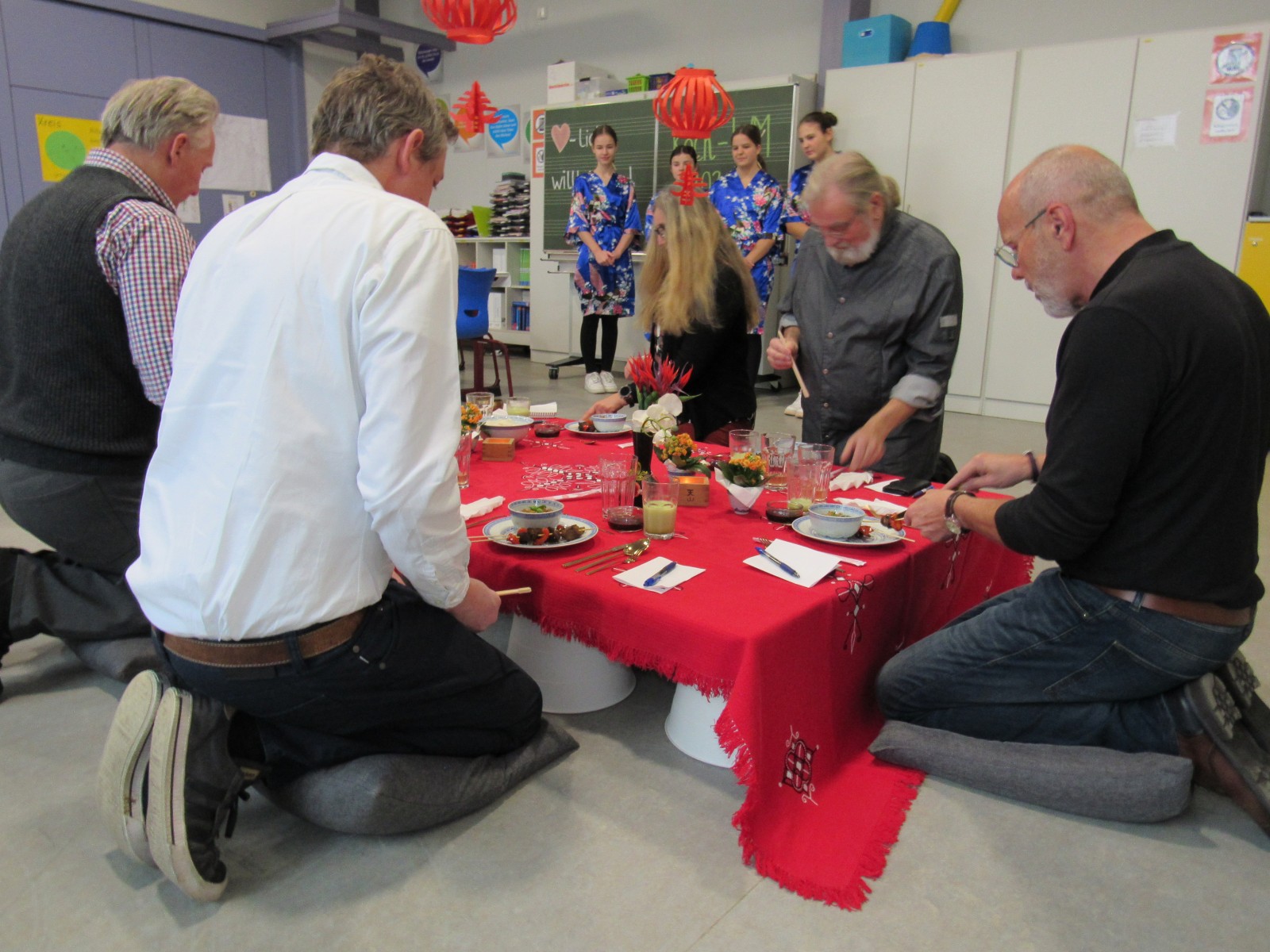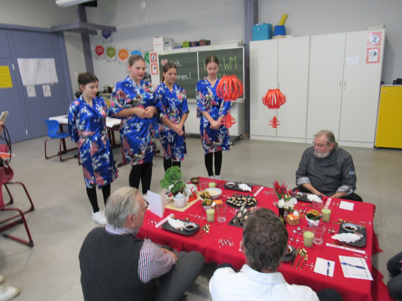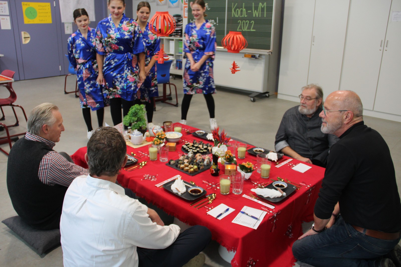 Lang war von Beginn an in der Jury dabei. Die Koch-WM bringe den Schülern die Arbeit in der Gastronomie näher, lobte er das Konzept der Schule und wurde von einem der griechischen Jung-Köche bestätigt. Er habe bislang nie gekocht, übe jetzt aber laufend mit seiner Mutter. Das Menu bestand aus griechischem Salat, Bifteki und selbstgemachten griechischen Joghurt zur Nachspeise. Den ersten Platz sicherte sich das japanische Team, das in der Präsentation und mit Sushi in der Vorspeise die meisten Tore einheimste. Ihre Leistung kann das siegreiche Team nun beim Pflugwirt Wilhelm Maier beweisen. Er lud sie zum Profi-Schnuppern, kochen und genießen in seine gastronomischen Räume. Maier, der erstmals in der Jury saß, lobte das Engagement der Schule, die das Handwerk fördere. Er selbst habe Systemgastronomie gelernt, helfe aber leidenschaftlich gerne in der Küche aus.