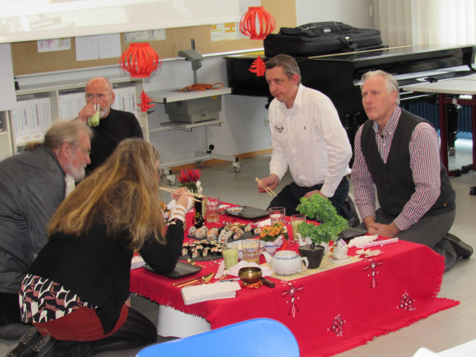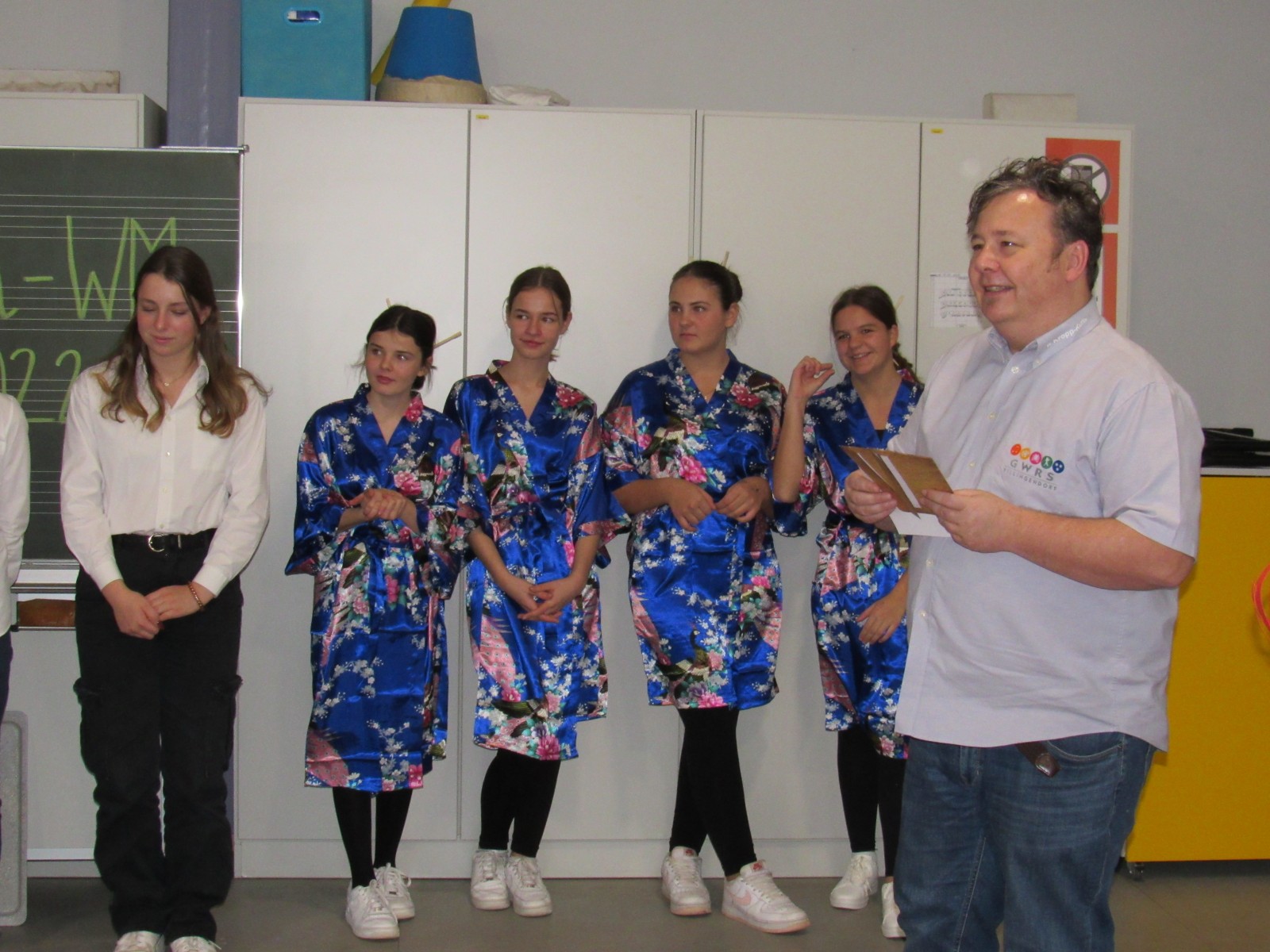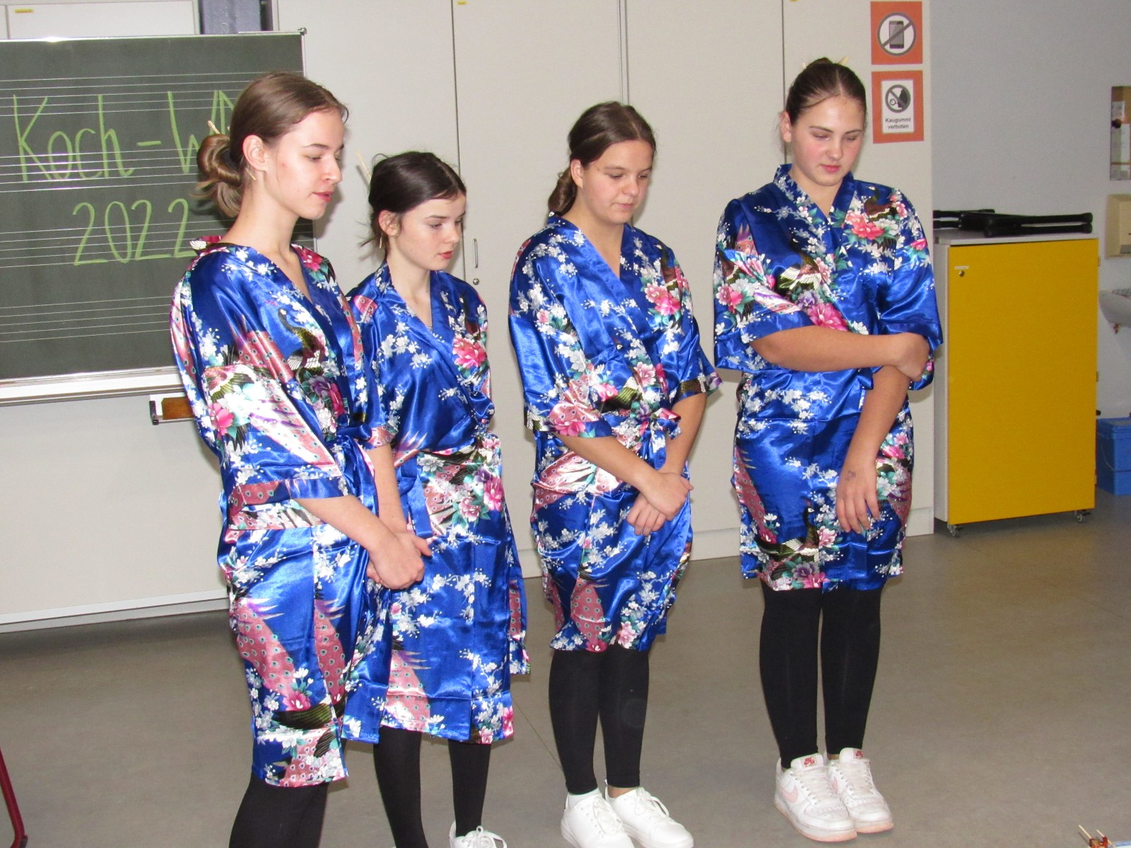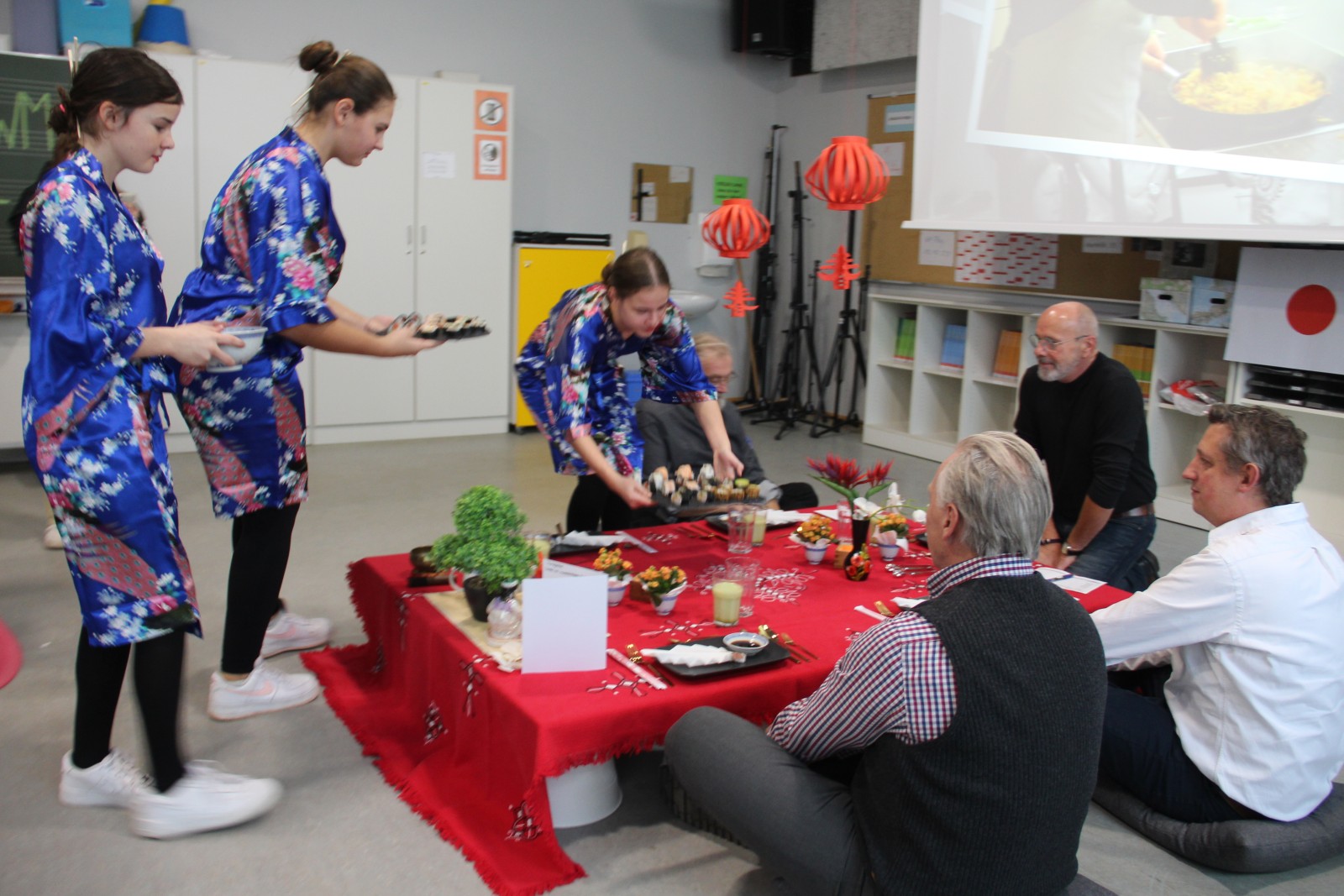 Lang war von Beginn an in der Jury dabei. Die Koch-WM bringe den Schülern die Arbeit in der Gastronomie näher, lobte er das Konzept der Schule und wurde von einem der griechischen Jung-Köche bestätigt. Er habe bislang nie gekocht, übe jetzt aber laufend mit seiner Mutter. Das Menu bestand aus griechischem Salat, Bifteki und selbstgemachten griechischen Joghurt zur Nachspeise. Den ersten Platz sicherte sich das japanische Team, das in der Präsentation und mit Sushi in der Vorspeise die meisten Tore einheimste. Ihre Leistung kann das siegreiche Team nun beim Pflugwirt Wilhelm Maier beweisen. Er lud sie zum Profi-Schnuppern, kochen und genießen in seine gastronomischen Räume. Maier, der erstmals in der Jury saß, lobte das Engagement der Schule, die das Handwerk fördere. Er selbst habe Systemgastronomie gelernt, helfe aber leidenschaftlich gerne in der Küche aus.
