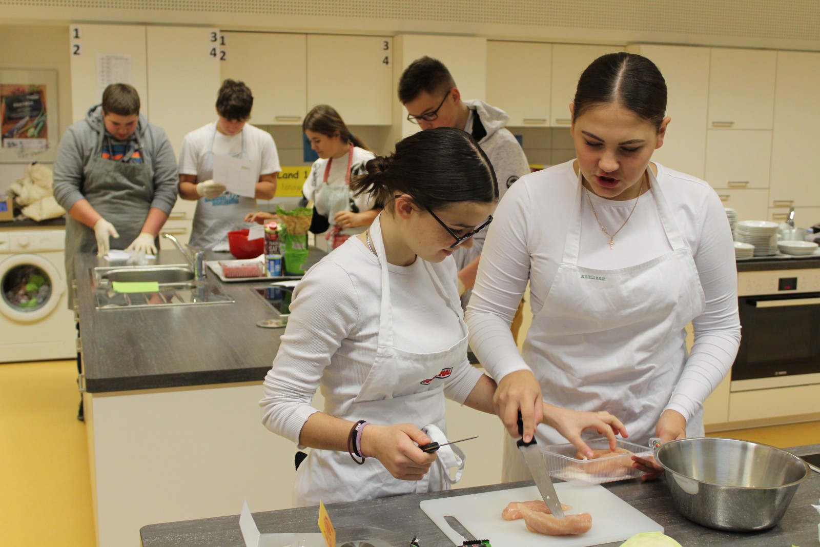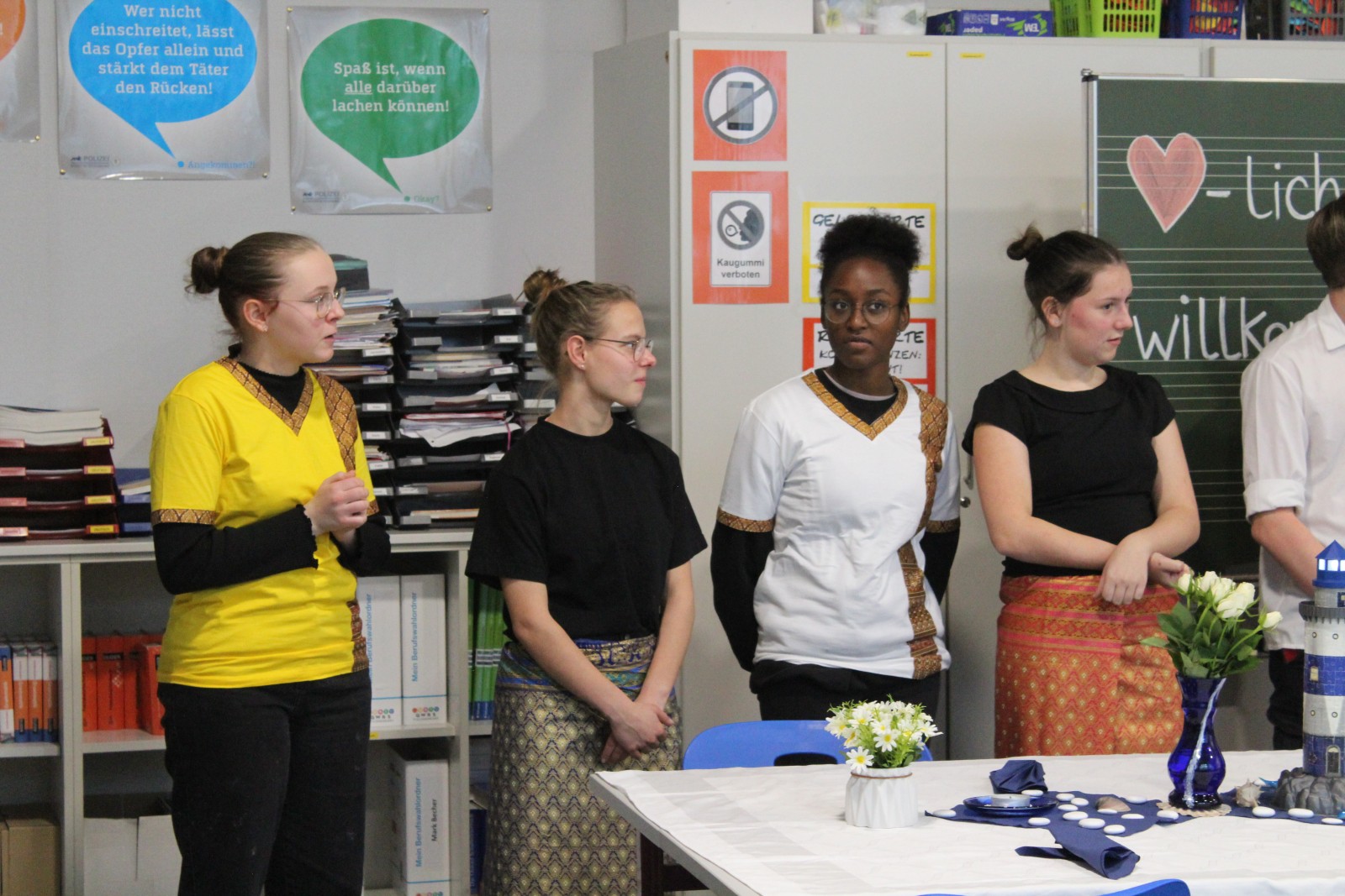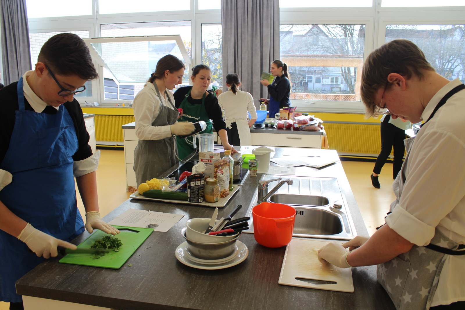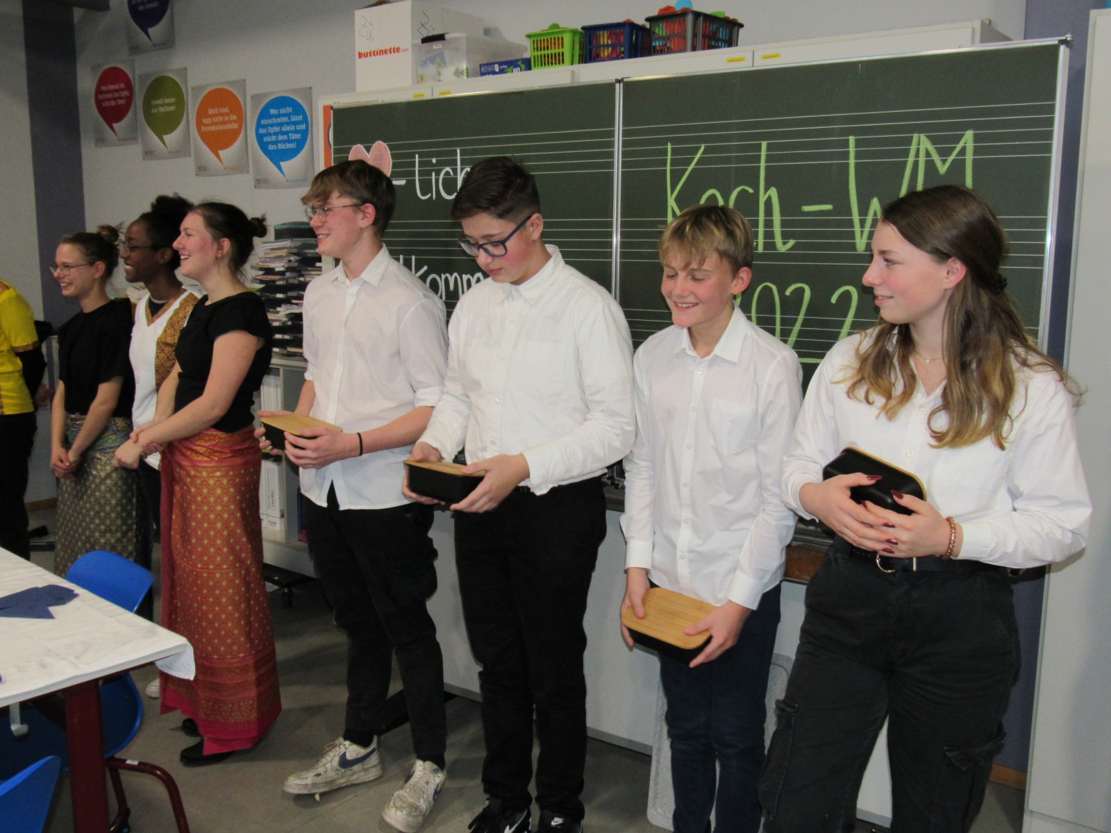 Im Vorfeld entscheiden die Teams mitsamt ihren Coaches, welches Land sie vertreten. Absolut zufrieden mit ihrer Wahl war das griechische Schulteam. Mit dem „leckeren griechischen Essen“ erreichten sie wie die Teams aus Thailand und Japan das Finale. An den Tischen warteten fünf Jurymitglieder. Darunter mit Pit Lang aus der Krone in Villingendorf und Wilhelm Maier vom Pflug in Rottweil zwei Profis. „Bei mir werdet ihr es schwer haben“, warnte Lang das Team Thailand. „Aber ich freu mich riesig, ich bin Thailandfan“. Enttäuscht wurde er nicht. Das Team heimste für seine Sommerrolle als Vorspeise, Karaage zur Hauptspeise und Kokosquark zum Nachtisch viel Lob ein und punktete mit Wissen zum Land und Kultur.