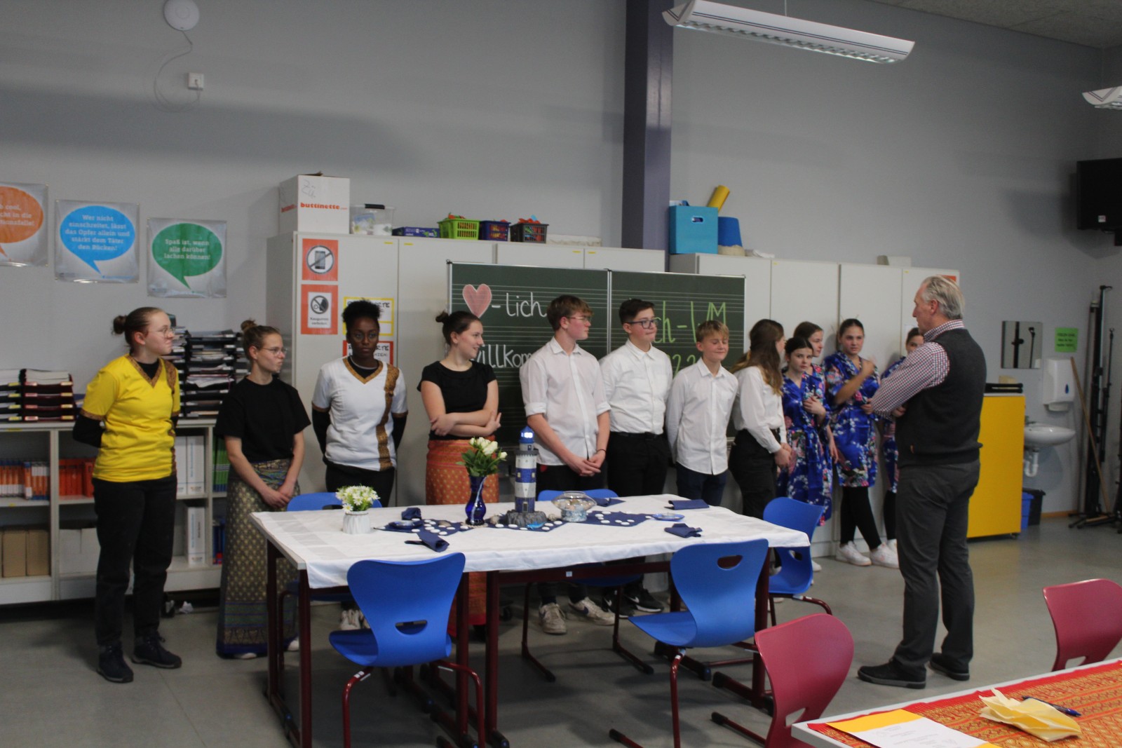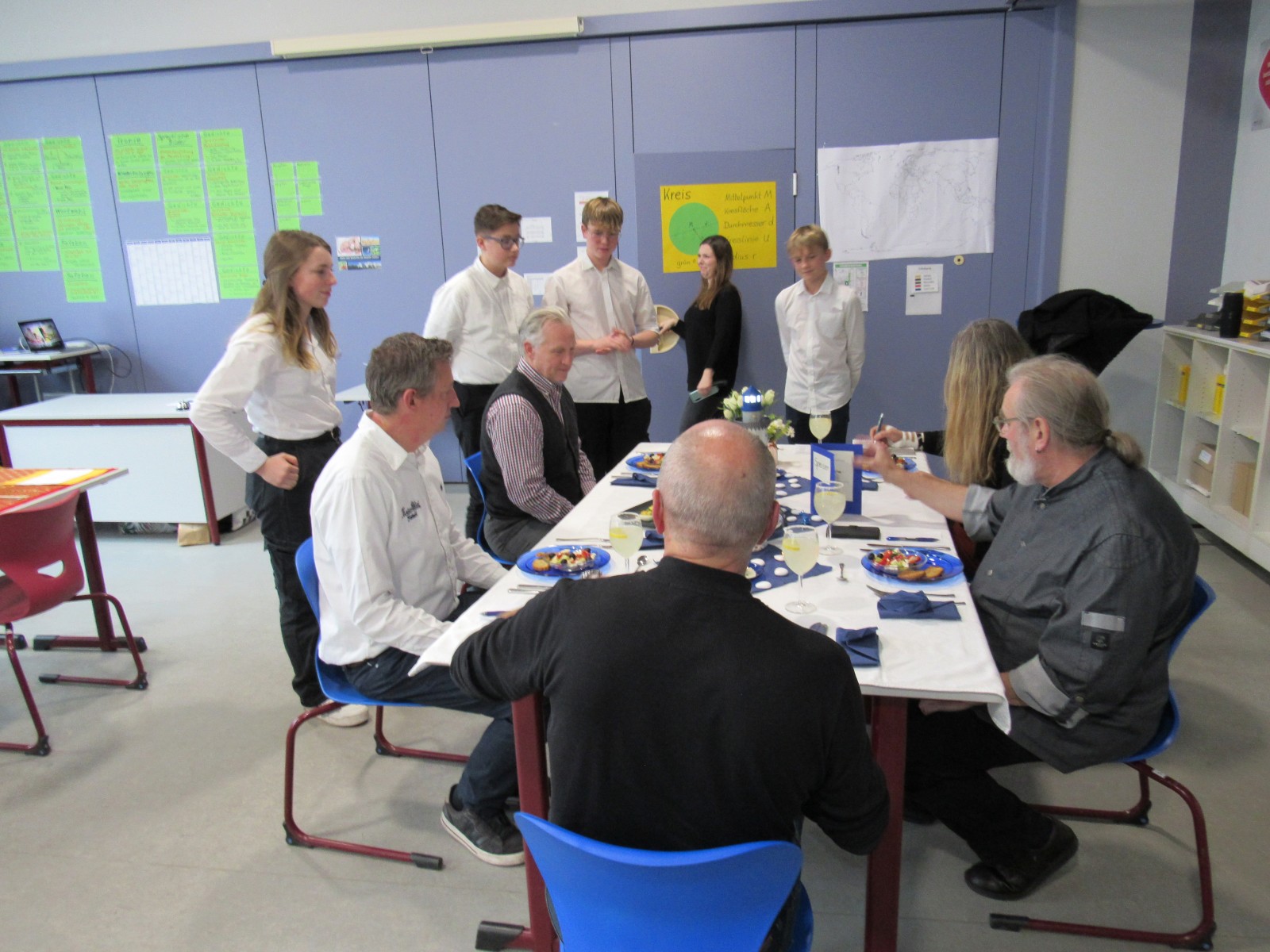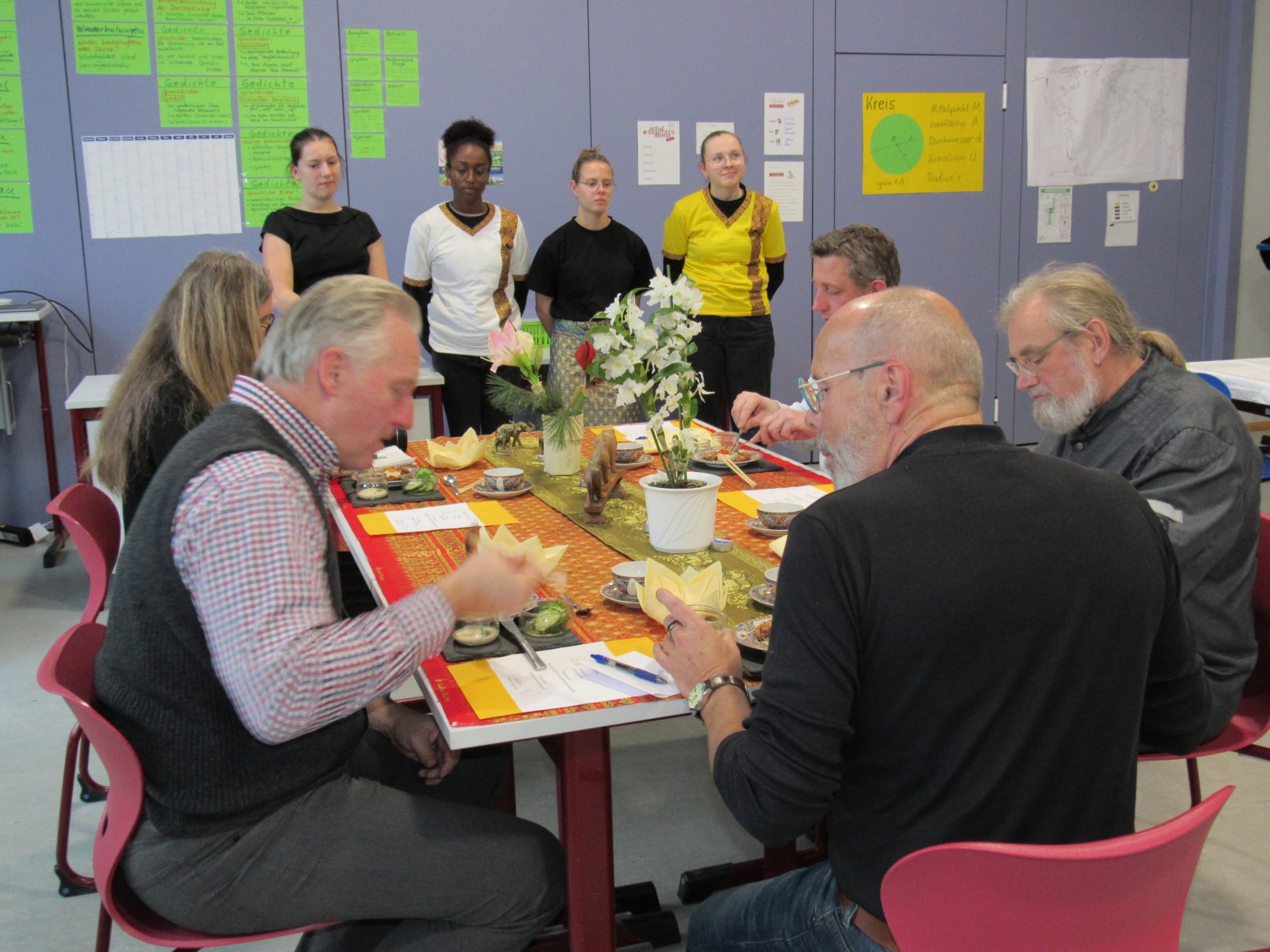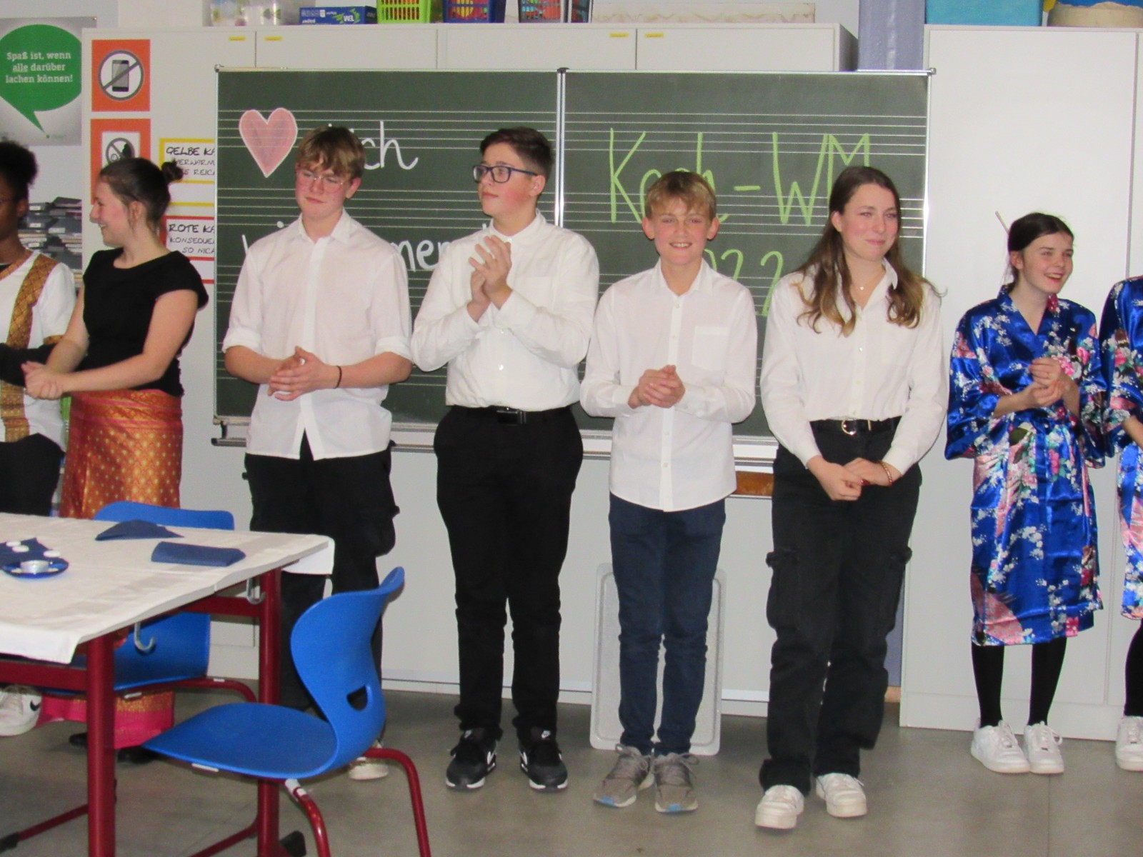 Im Vorfeld entscheiden die Teams mitsamt ihren Coaches, welches Land sie vertreten. Absolut zufrieden mit ihrer Wahl war das griechische Schulteam. Mit dem „leckeren griechischen Essen“ erreichten sie wie die Teams aus Thailand und Japan das Finale. An den Tischen warteten fünf Jurymitglieder. Darunter mit Pit Lang aus der Krone in Villingendorf und Wilhelm Maier vom Pflug in Rottweil zwei Profis. „Bei mir werdet ihr es schwer haben“, warnte Lang das Team Thailand. „Aber ich freu mich riesig, ich bin Thailandfan“. Enttäuscht wurde er nicht. Das Team heimste für seine Sommerrolle als Vorspeise, Karaage zur Hauptspeise und Kokosquark zum Nachtisch viel Lob ein und punktete mit Wissen zum Land und Kultur.
