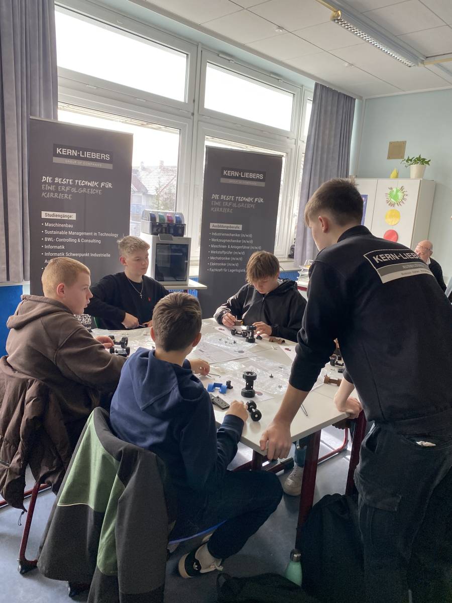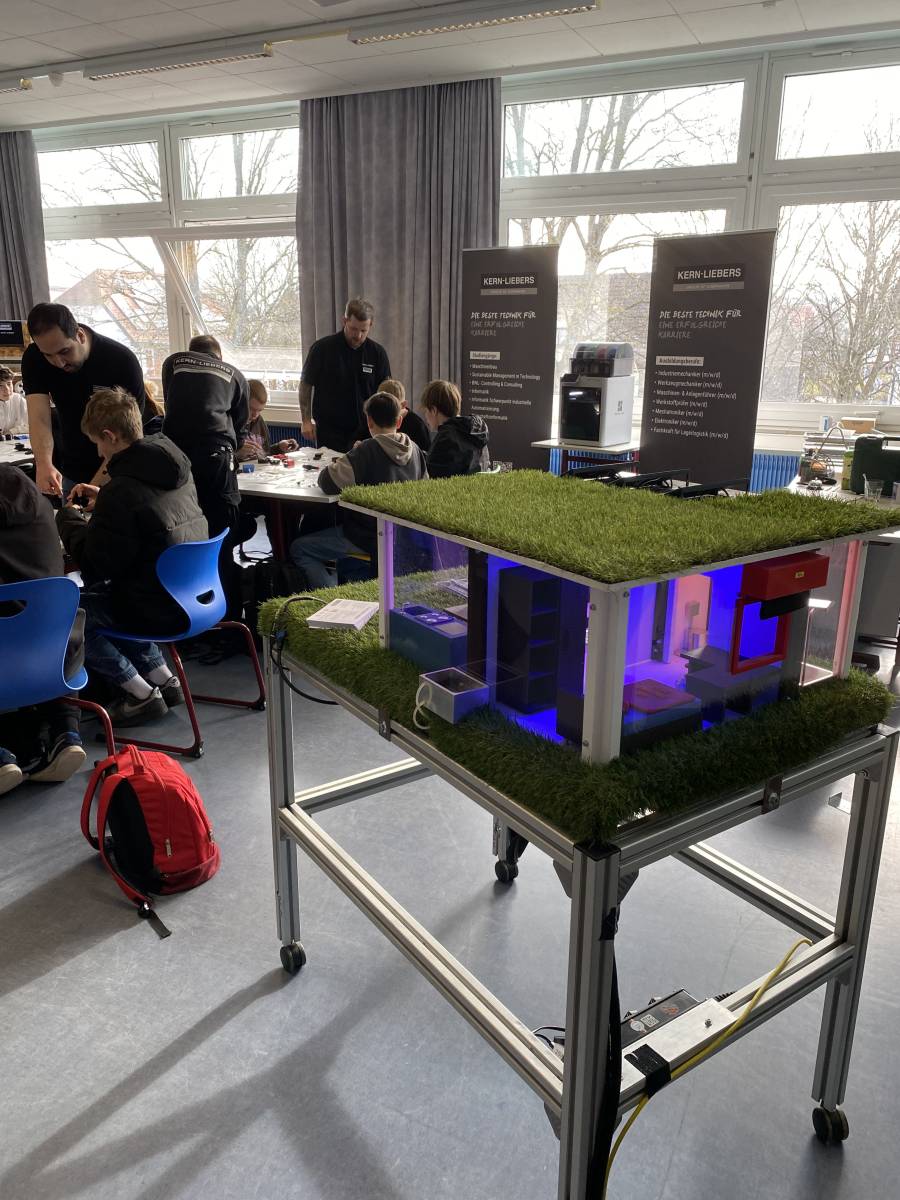 Die Auszubildenden planen und entwerfen im Rahmen ihrer Ausbildung bei KERN LIEBERS verschiedene Projekte bzw. Modelle. Einige dieser Modelle durften die Schülerinnen und Schüler der achten Klasse nach der erfolgreicher Montage ihres eigenen kleinen Traktors erkunden. Sie bestaunten das Smarthome-Modell, bei dem sowohl Temperatur als auch Licht und die angebrachten Rollläden über ein Smartboard gesteuert werden können. Außerdem beobachteten sie einen programmierten 3D-Drucker, spielten an dem selbstgebauten Pinball-Automaten oder machten mit der VR-Brille einen virtuellen Rundgang durch die Firma.