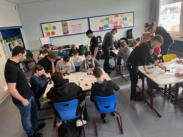 Anschließend gingen die Schülerinnen und Schüler ins aktive Tun über – sie durften einen Miniatur-Traktor aus Aluminium und Kunststoff (im 3D-Drucker gedruckt und von Auszubildenden entworfen bzw. programmiert) mit Hilfe eines Bauplans zusammenbauen und die 20 Bauteile montieren. Unterstützt wurden die Jugendlichen hierbei von einem Ausbilder im Bereich Elektronik, Marvin Roth und sechs Auszubildenden der Firma KERN LIEBERS. So ergab sich für beide Seiten eine lehrreiche Situation: die Schülerinnen und Schüler wurden von den Auszubildenden bei der Montage des Traktors unterstützt und erhielten einen ersten Einblick in die Arbeit mit entsprechenden Plänen und die Auszubildenden ihrerseits konnten sich darin üben, andere anzuleiten und verständlich zu erklären, was es beim eigens entworfenen Bauplan zu beachten gilt.