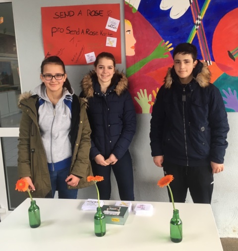 Diese Woche findet an unserer Schule die Aktion "Send a rose“ statt, bei der jeder Schüler und Lehrer die Möglichkeit hat, einem anderen Menschen einmal Danke zu sagen. Mit gestalteten Karten können die Schüler zwischen einem Schokoladenhasen und einer Rose wählen, welche sie einem Schüler kommende Woche zukommen lassen möchten. Die Aktionskarten können noch bis Ende der Woche erworben werden und wir freuen uns schon auf die lächelnden Gesichter, wenn wir alles überreichen können.