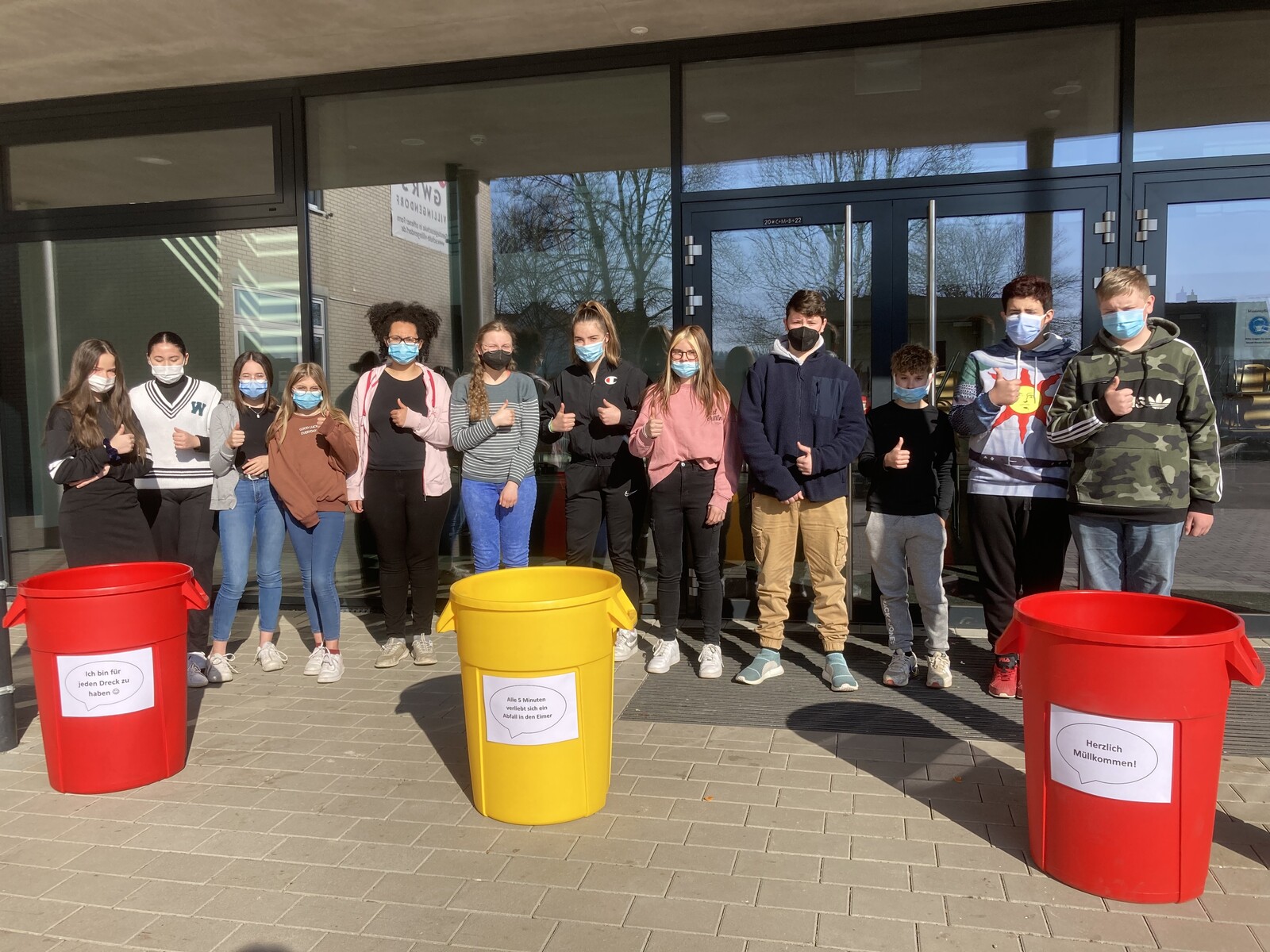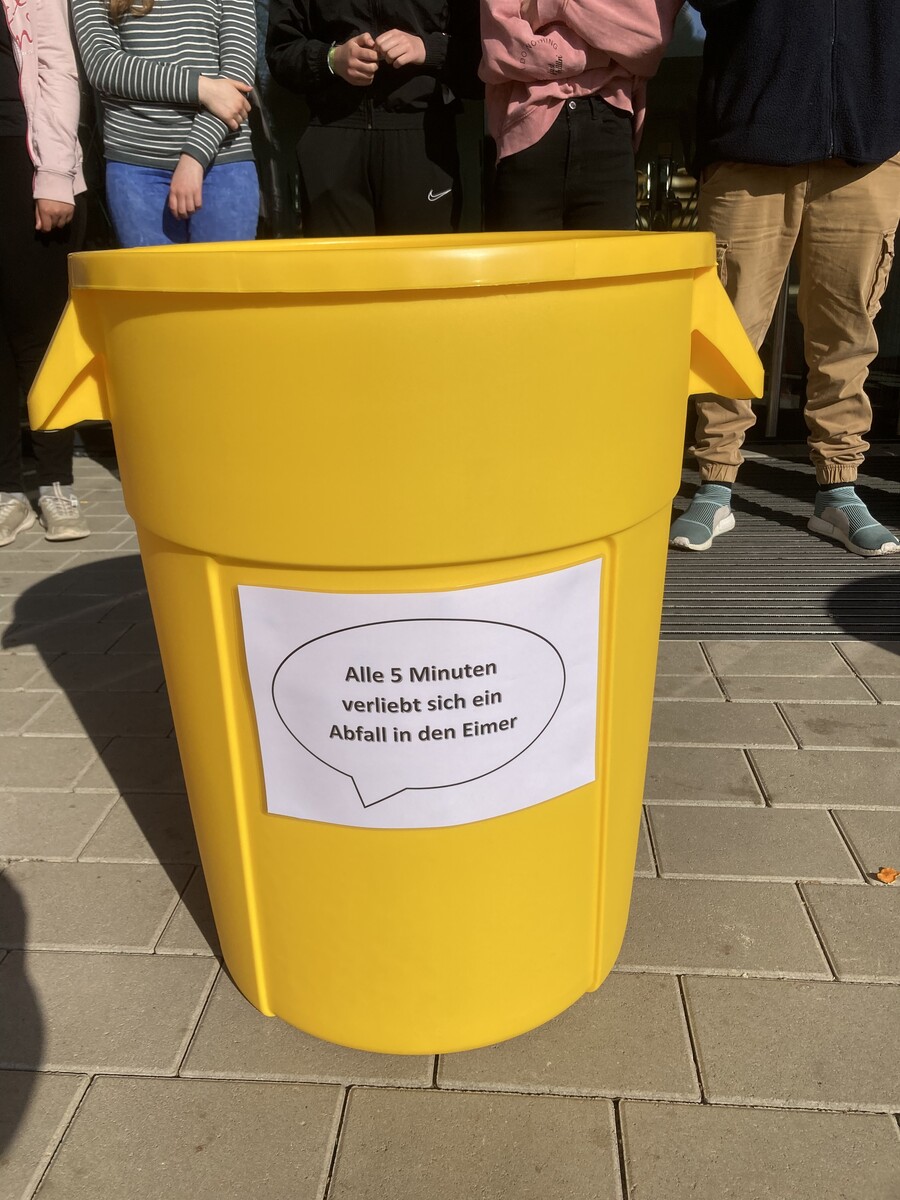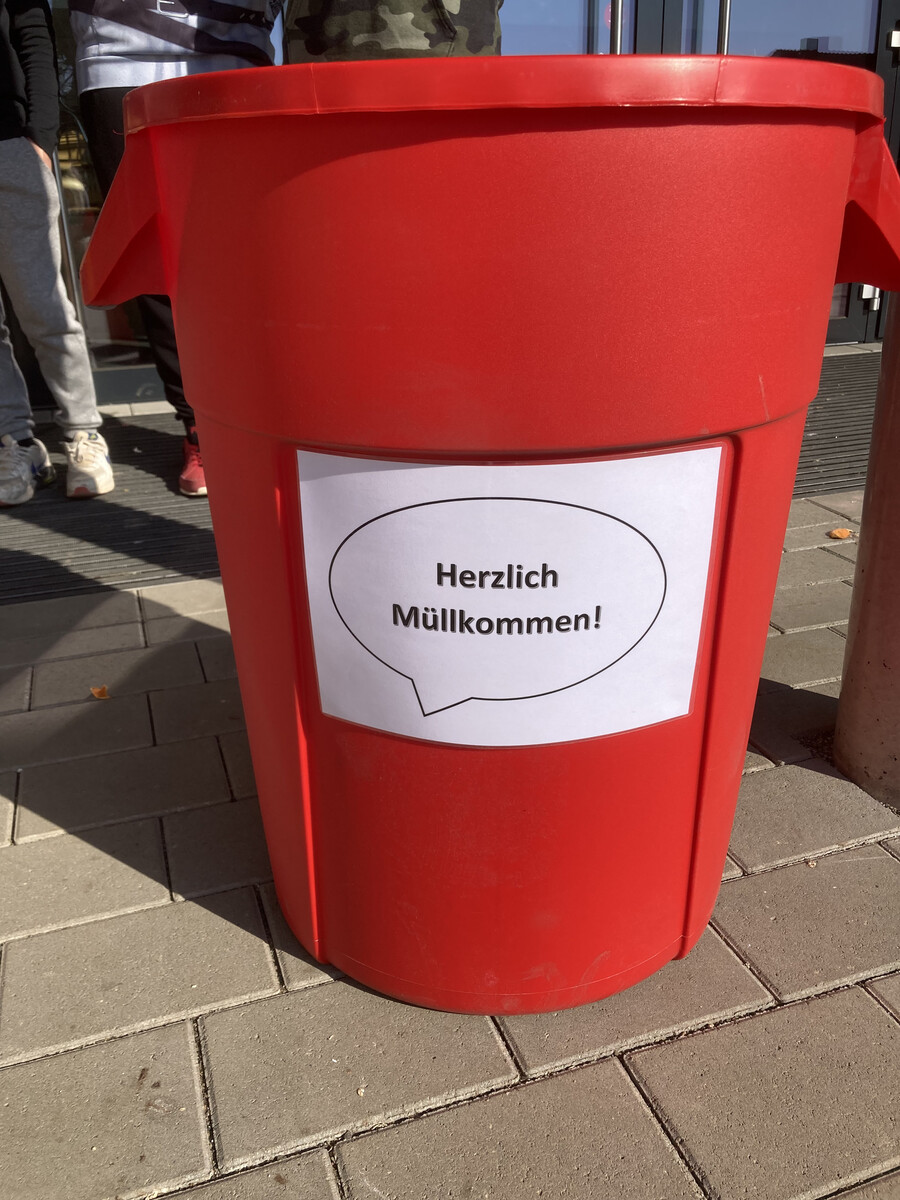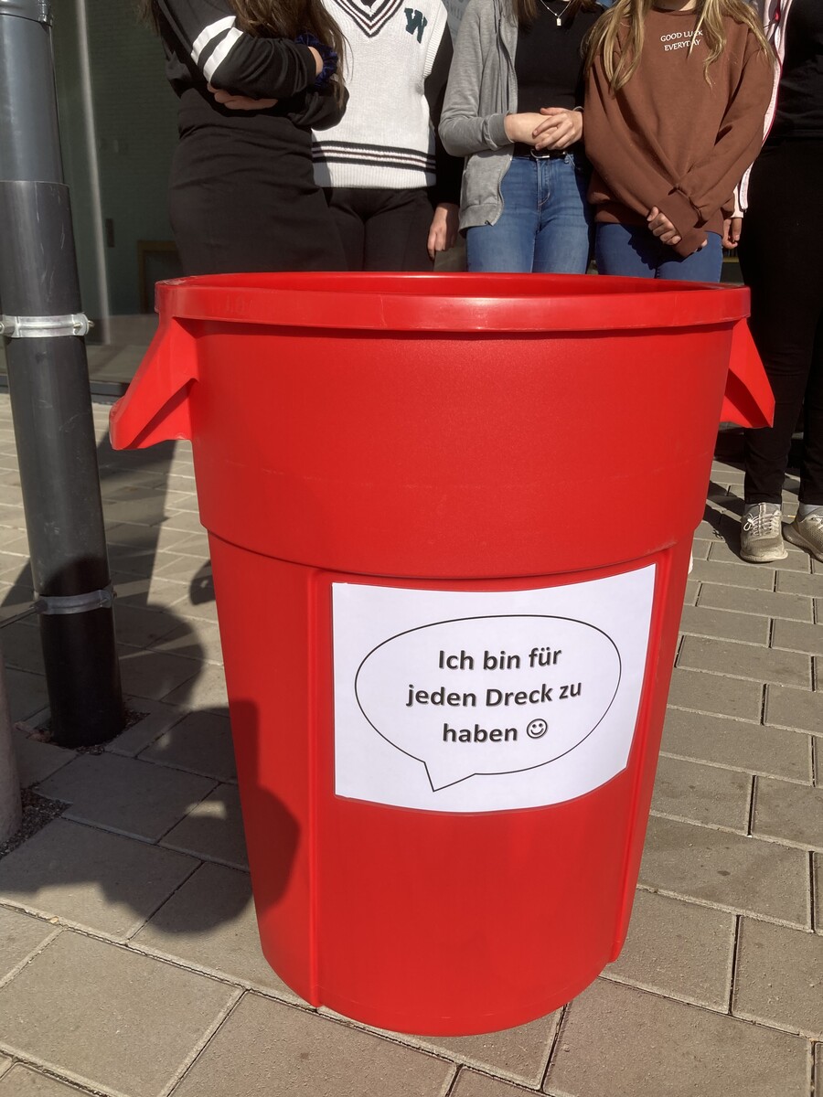 Die Schülermitverantwortung (SMV) wollte nicht abwarten, bis der Pausenhof final umgestaltet wird. Da durch den Neubau der Halle nur ein kleiner Mülleimer für über 400 Schülerinnen und Schüler übrig geblieben war, wurden nun drei große farbenfrohe Müllschlucker angeschafft und mit lustigen Sprüchen versehen.