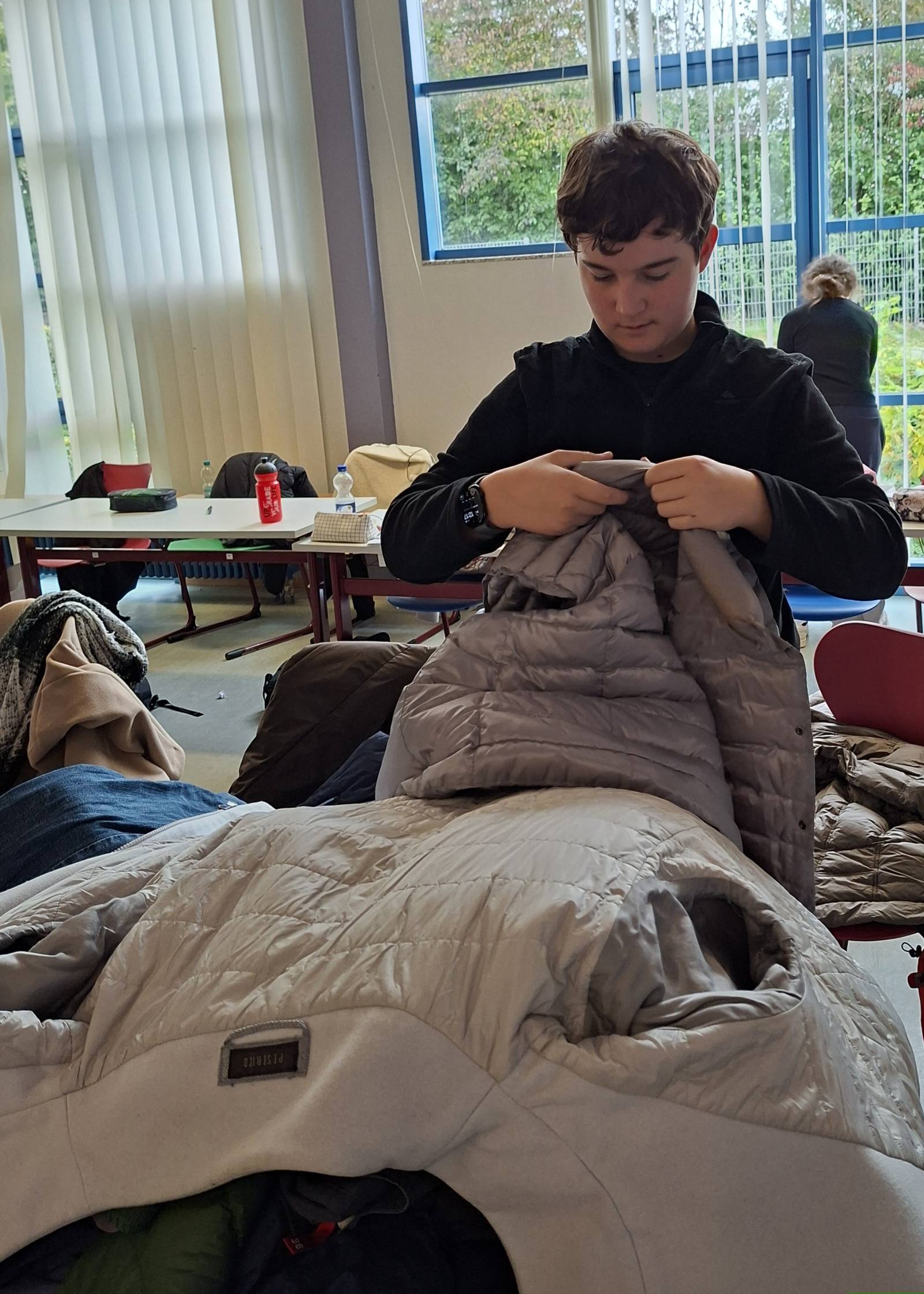 Dazu nutzen die „Zehner“ ihre privaten und schulischen Netzwerke, um gut tragbare Gebrauchtkleidung zu sammeln, die sich in einem vergleichsweise sehr guten Zustand befindet. Bis zu den Herbstferien betreiben die Schülerinnen und Schüler wochentags während der ersten Pause eine Sammelstelle in der Schulaula, bei der die Kleidungsspenden sofort gesichtet, qualitativ bewertet und nach bestimmten Kriterien kategorisiert werden. Verschmutzte oder beschädigte Kleidungsstücke, Unterwäsche sowie Schuhe werden dabei gar nicht erst angenommen.