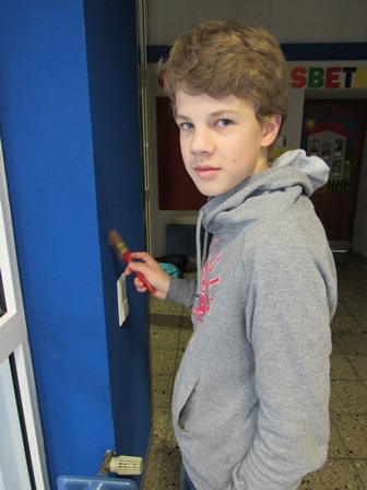 Wir bessern zum Beispiel Wände aus, um sie danach zu streichen. Dadurch setzen wir farbliche Akzente im Schulhaus. Wir bestücken die Rahmen und Glaskästen mit neuen Bildern, um immer ein aktuelles Bild der Arbeit an der Schule zu haben. Wir stellen kreative Bilder und Kunstwerke her, um sie im Schulhaus auszustellen und vieles mehr.