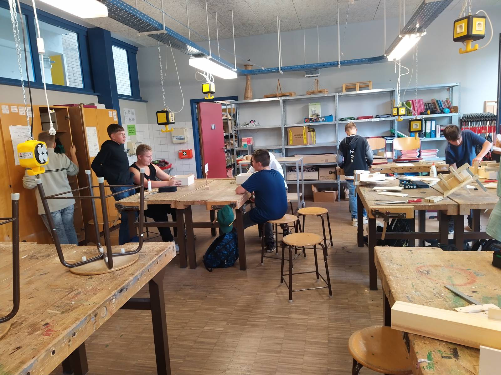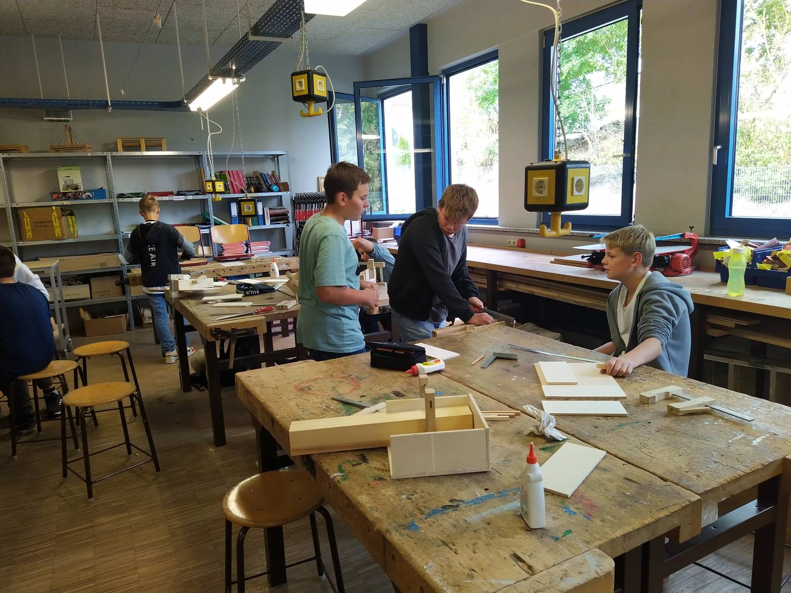 Geschrieben am 07. Dezember 2023. Aktuell leimen wir für den Technikraum Holzkisten, die dann noch geschliffen werden. Geplant ist noch die Herstellung von Kartenhaltern, Trennwänden und Holzbehälter für die Grundschule, dabei wird gesägt, gefeilt, geleimt und geschliffen.