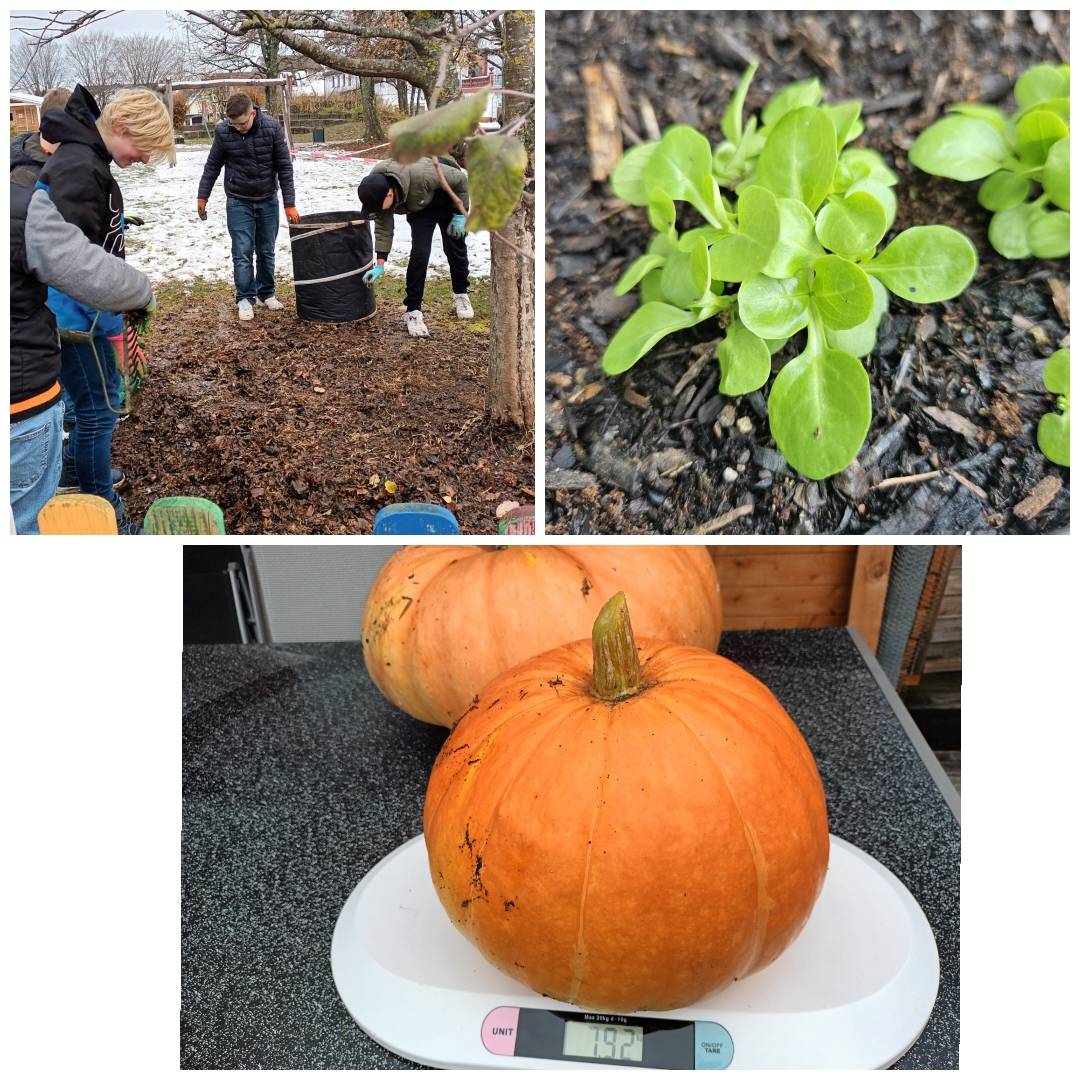Sie durchlaufen gemeinsam mit der Lehrerin, Frau Schlieter, ein gesamtes Gartenjahr: im Herbst werden Kürbisse, Tomaten, Grünkohl, Schwarzwurzeln und die letzten Radieschen geerntet. Das Gemüse wird im AES-Unterricht und in der Mensa zu leckeren Speisen weiterverarbeitet. Im Winter hält der Schulgarten unter einer dicken Mulchschicht Winterruhe. Im Frühjahr werden die Beete wieder gerichtet und das erste Gemüse gesät und gepflanzt, so dass vor den Sommerferien die erste Ernte zu erwarten ist.