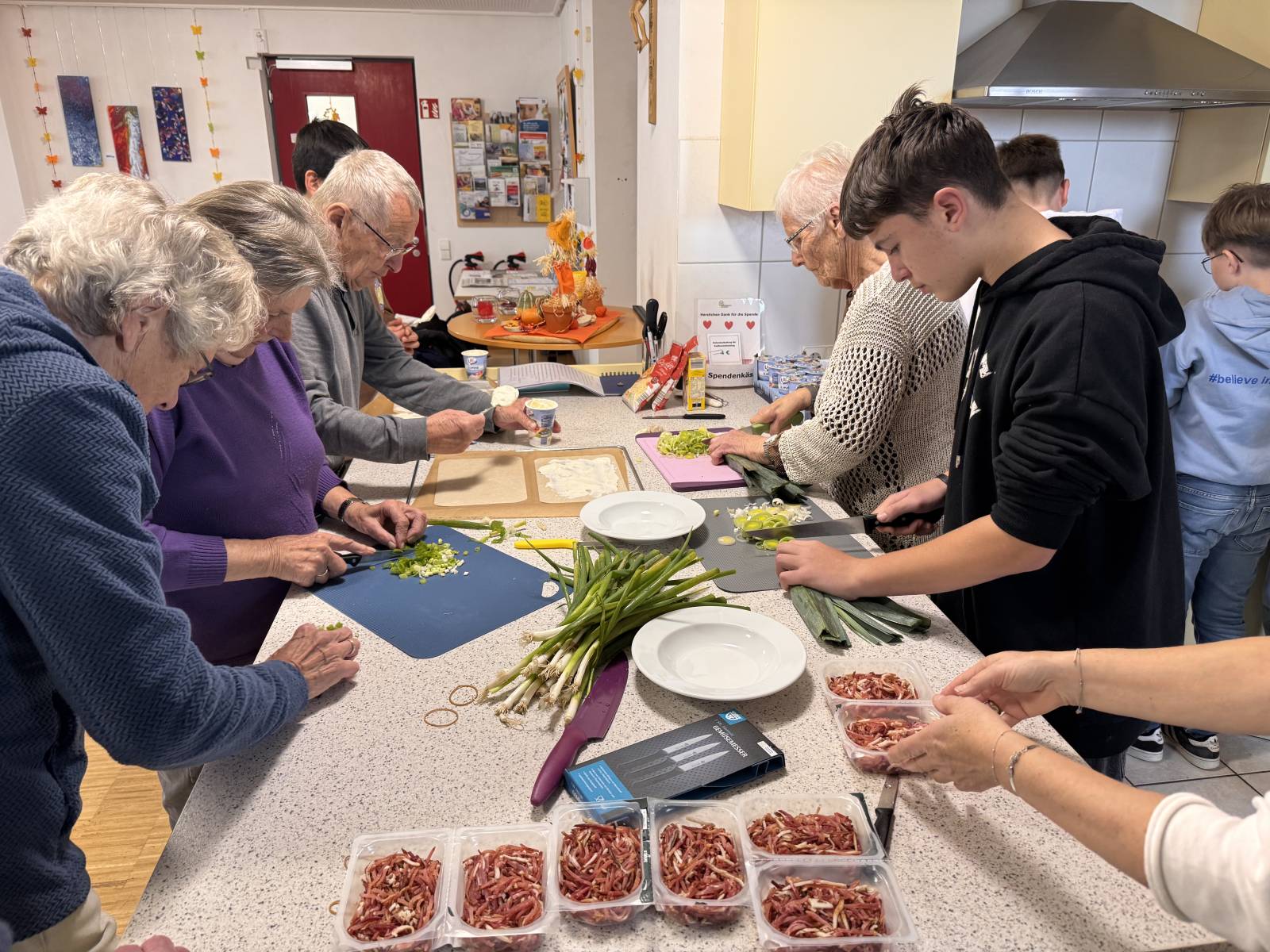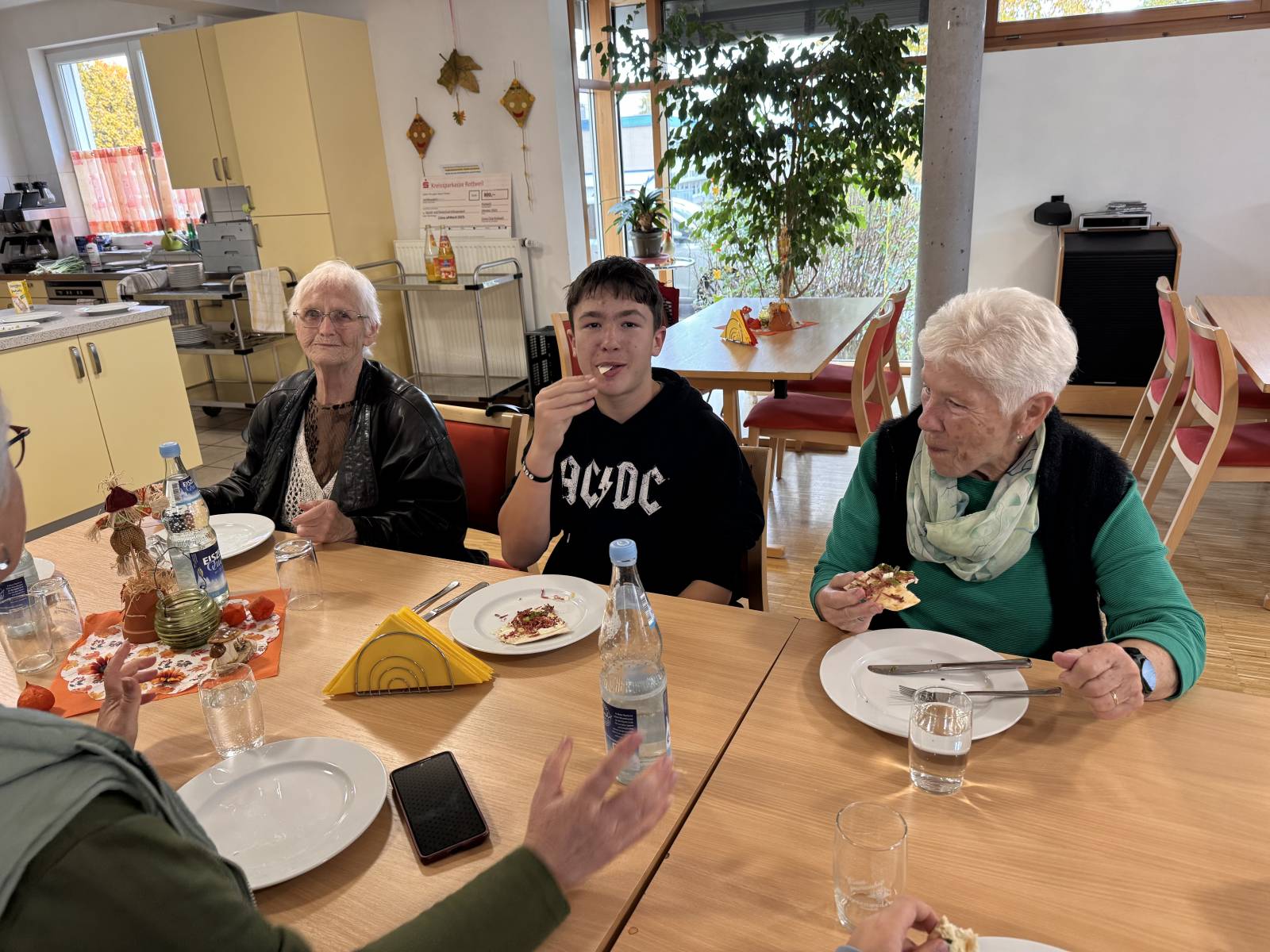 Freundschaft & Gemeinschaft gehen, ebenso wie Liebe, bekanntlich durch den Magen - das war das Motto des dritten Treffens der Sozialwerkstatt "Jung trifft Alt" am Montag, 21. Oktober: passend zum Herbstwetter bereiteten die Senioren und die Schülerinnen und Schüler der Sozialwerkstatt in der Küche des Aufenthaltsraums der Seniorenwohnanlage selbst Flammenkuchen zu.
